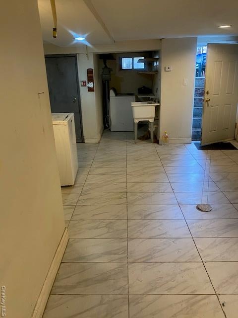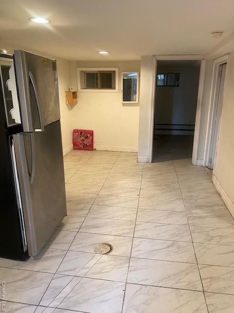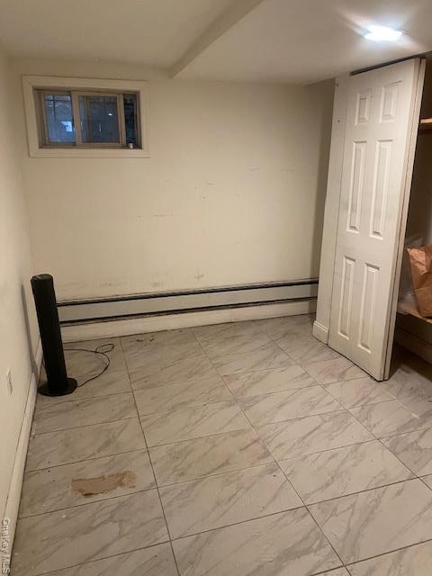 - Finished below grade area featuring light marble finish floors and baseboard heating
