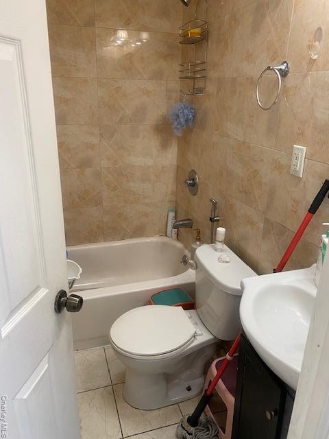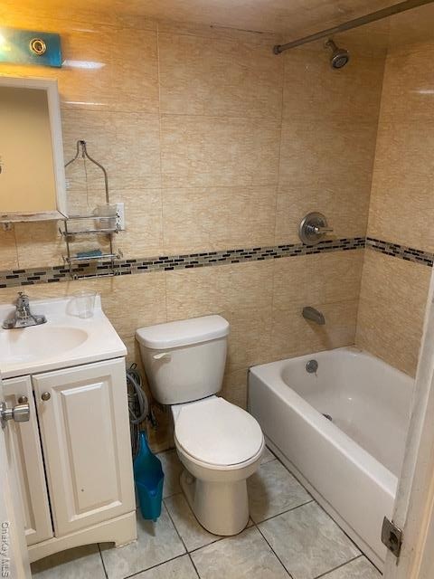 - Full bathroom featuring tile walls, vanity, and shower combination