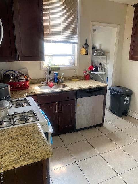 - Kitchen with dishwasher, stove, dark brown cabinets, and light tile patterned floors