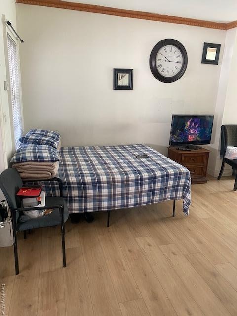 - Bedroom with wood-type flooring and ornamental molding