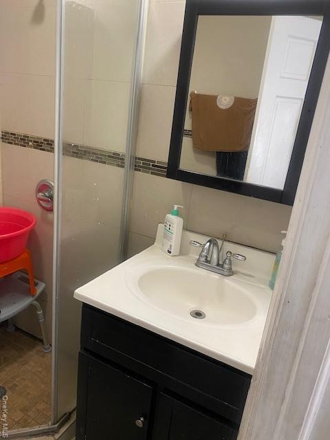 - Bathroom with vanity, a shower stall, and tile walls