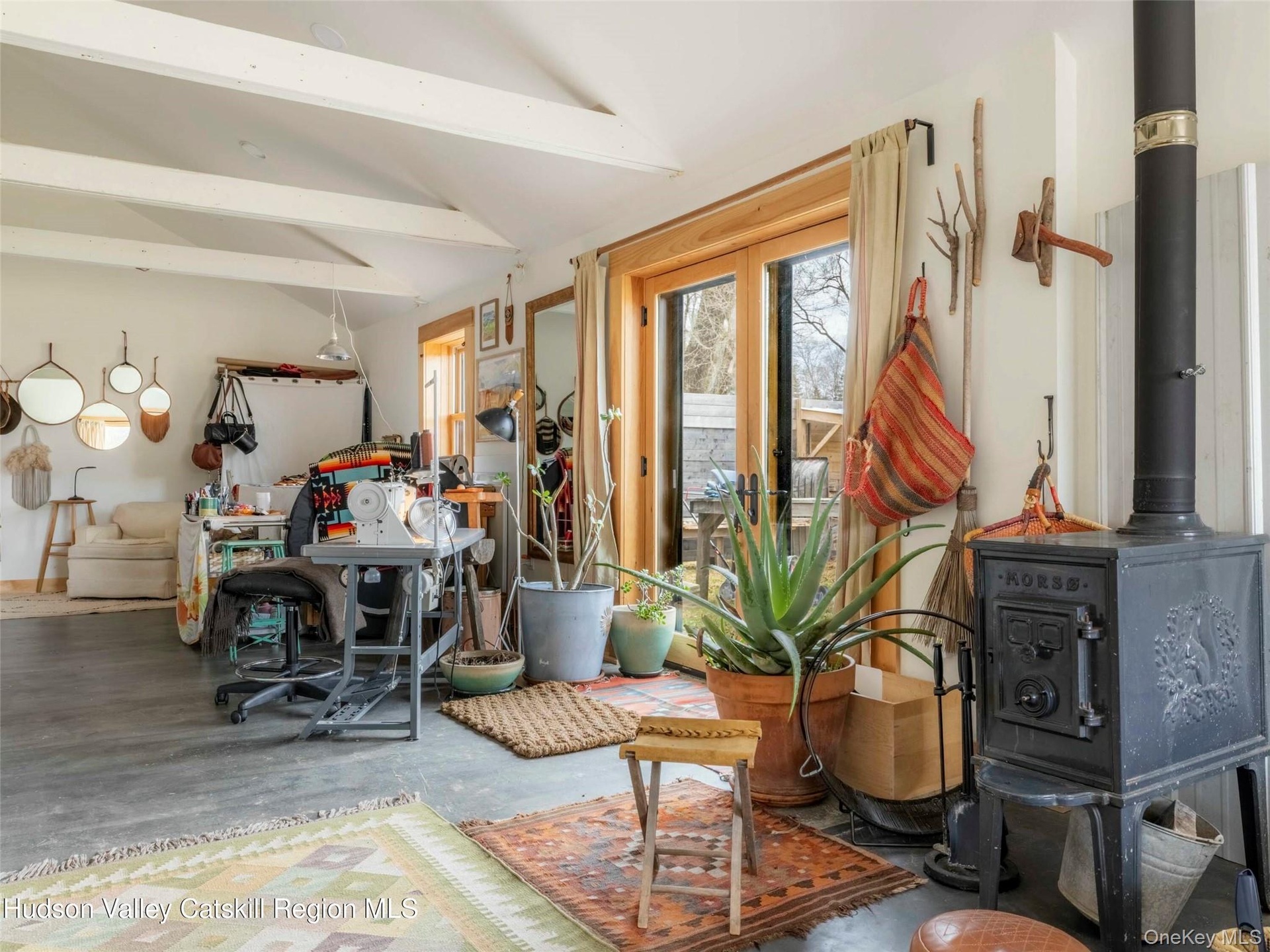 - Living room featuring concrete floors, a wood stove, and vaulted ceiling with beams