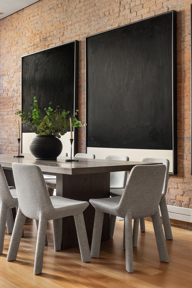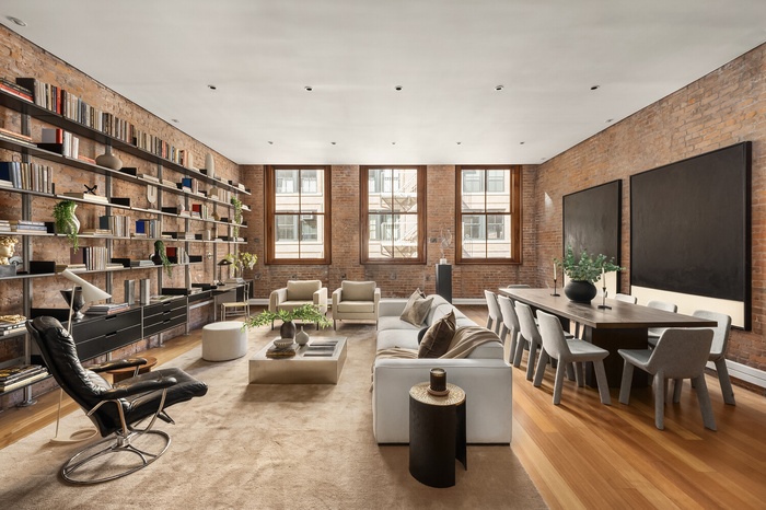 The sun-drenched living room features a trio of oversized sash windows with northeast exposure, while the dining area seamlessly flows into a sleek Valcucine-designed kitchen. Outfitted with Caesarstone countertops, custom cabinetry, and top-of-the-line integrated appliances-including a Sub-Zero refrigerator, Viking gas cooktop, Kupperbusch wall oven, and a built-in Miele espresso machine-the kitchen is a minimalist masterpiece.