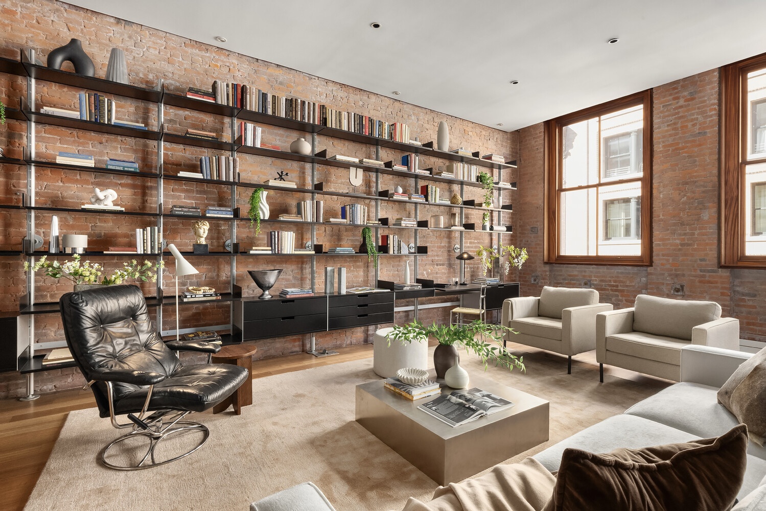 Soaring 12-foot ceilings, exposed red brick walls, and rich hardwood floors create a warm, voluminous atmosphere throughout the expansive living space. A private, key-locked elevator opens directly into the home, revealing an open-concept layout ideal for both grand entertaining and comfortable daily living.