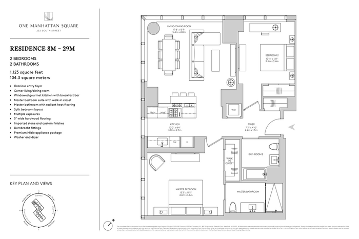Residence 25M is a 1,123 square foot two-bedroom, two-bathroom unit with an open gourmet kitchen and breakfast bar. This spacious corner residence has large windows facing Northwest and Southwest, with unimpeded East River, Manhattan Bridge, Brooklyn Bridge and NYC skyline views. Warm, modern interiors are brought to life by the renowned design team at Meyer Davis Studio. This residence features imported stone and custom finishes, premium Miele appliances, 5 wide stained oak flooring, master bath with custom wood cabinetry, marble tile walls and mosaic floors with radiant heat, undermount Wetstyle sink with glass vanity top and Dornbracht polished chrome faucets and a washer and dryer. Each bathroom features custom cabinetry, marble tile walls, a Wetstyle sink with glass vanity top, Dornbracht polished chrome faucets, and detailing; the master bathroom offers luxurious heated floors.