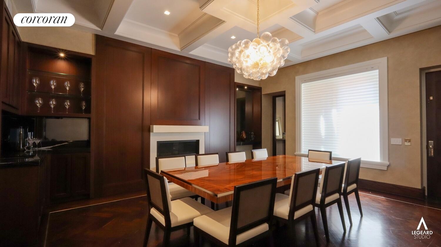 Take the handsome staircase or the state-of-the-art elevator to the second floor, where a luxe dining room sits beneath soaring 11-plus-foot ceilings with herringbone hardwood floors, a gas fireplace, a wet bar, and a wine lounge capable of housing over 1,000 bottles. The living room adjoins the dining room and has oversized windows, a wood-burning fireplace framed in white onyx and mahogany, radiant heat floors, and a powder room.