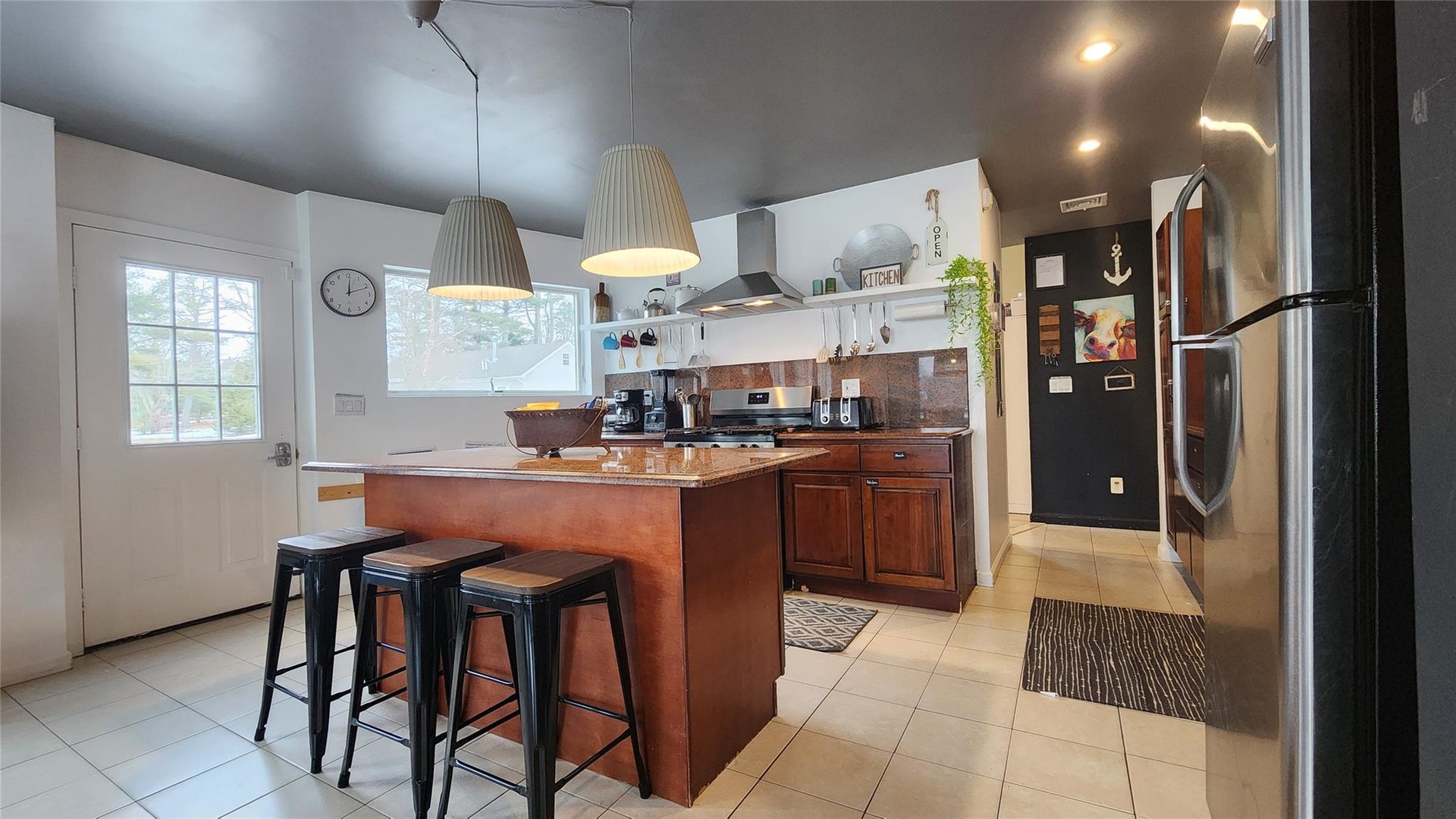- Kitchen featuring wall chimney range hood, a center island, open shelves, light tile patterned flooring, and appliances with stainless steel finishes