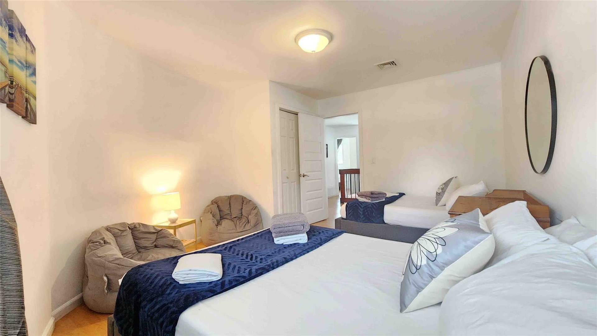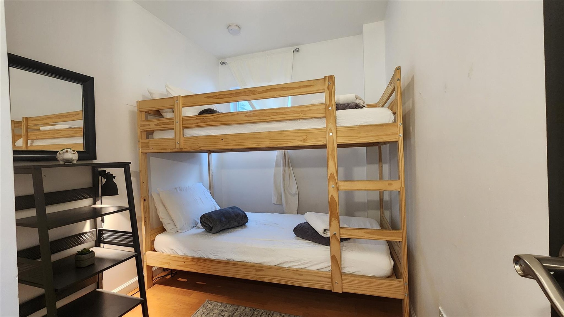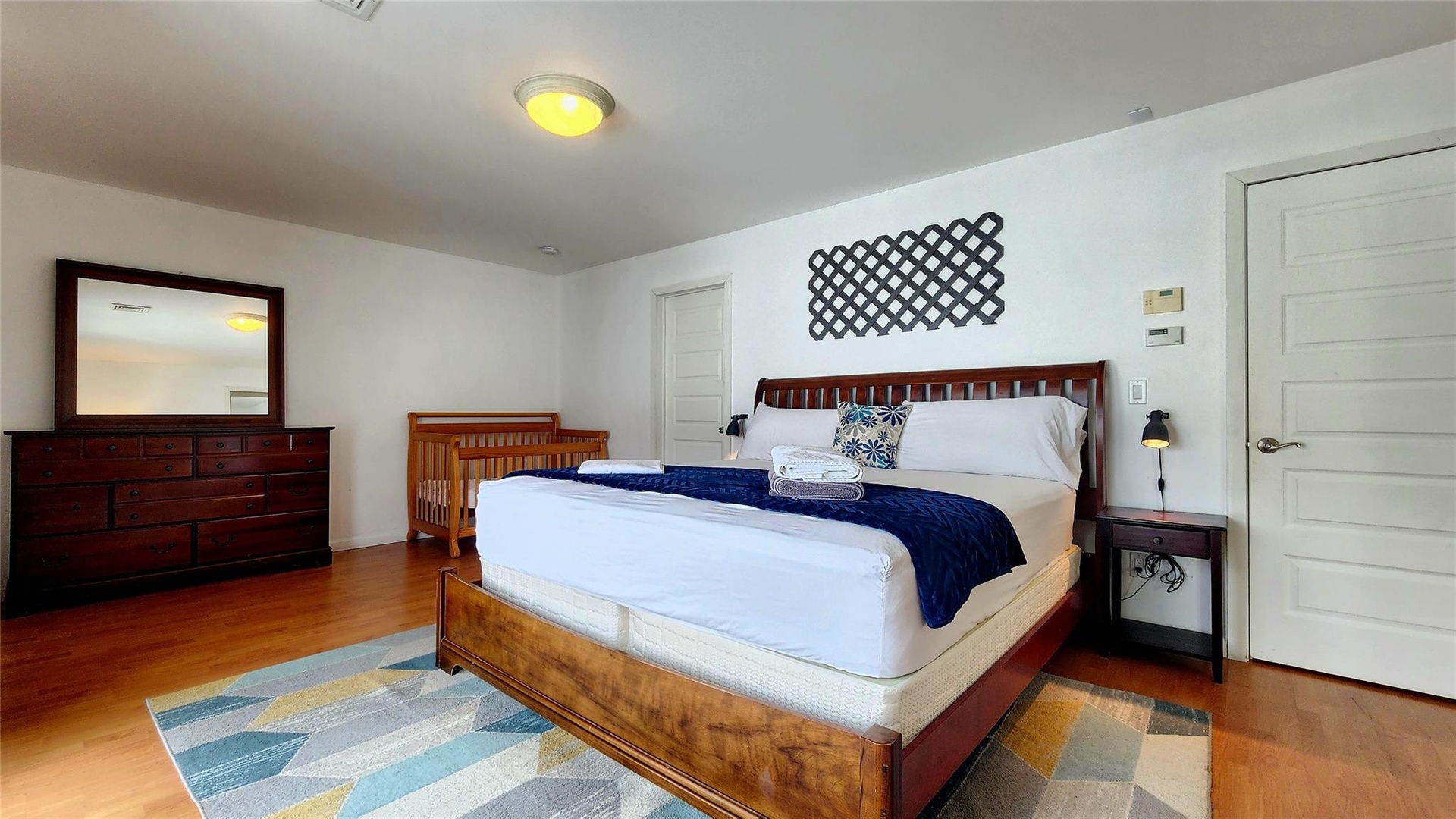 - Bedroom with light wood-style floors, visible vents, and baseboards