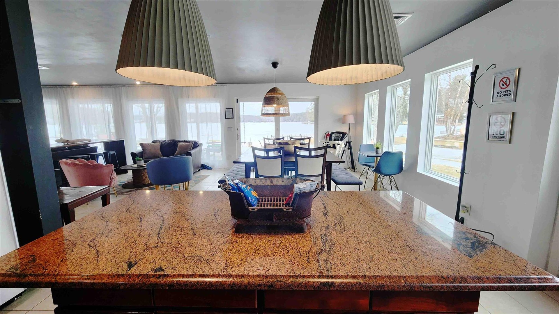 - Dining area featuring a water view, light tile patterned floors, and baseboards