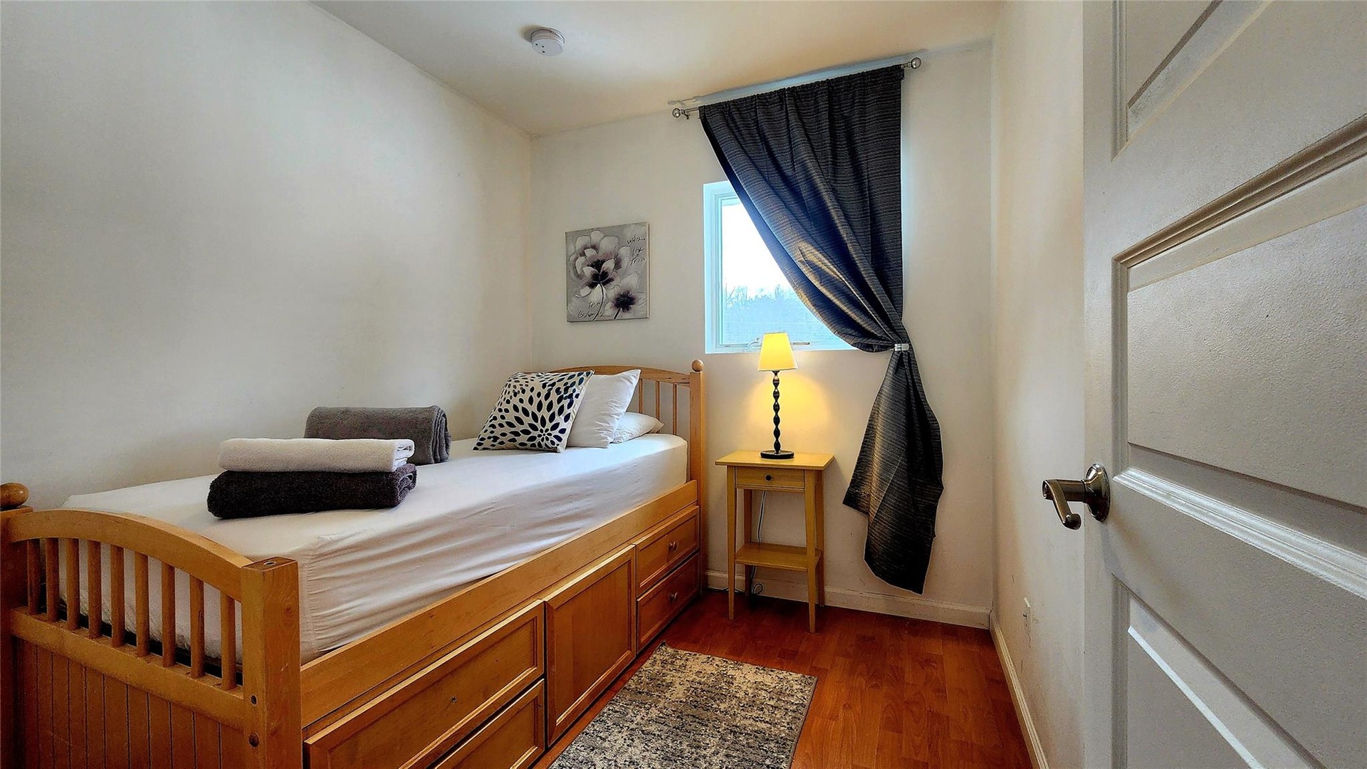 - Bedroom with access to outside, baseboards, and wood finished floors