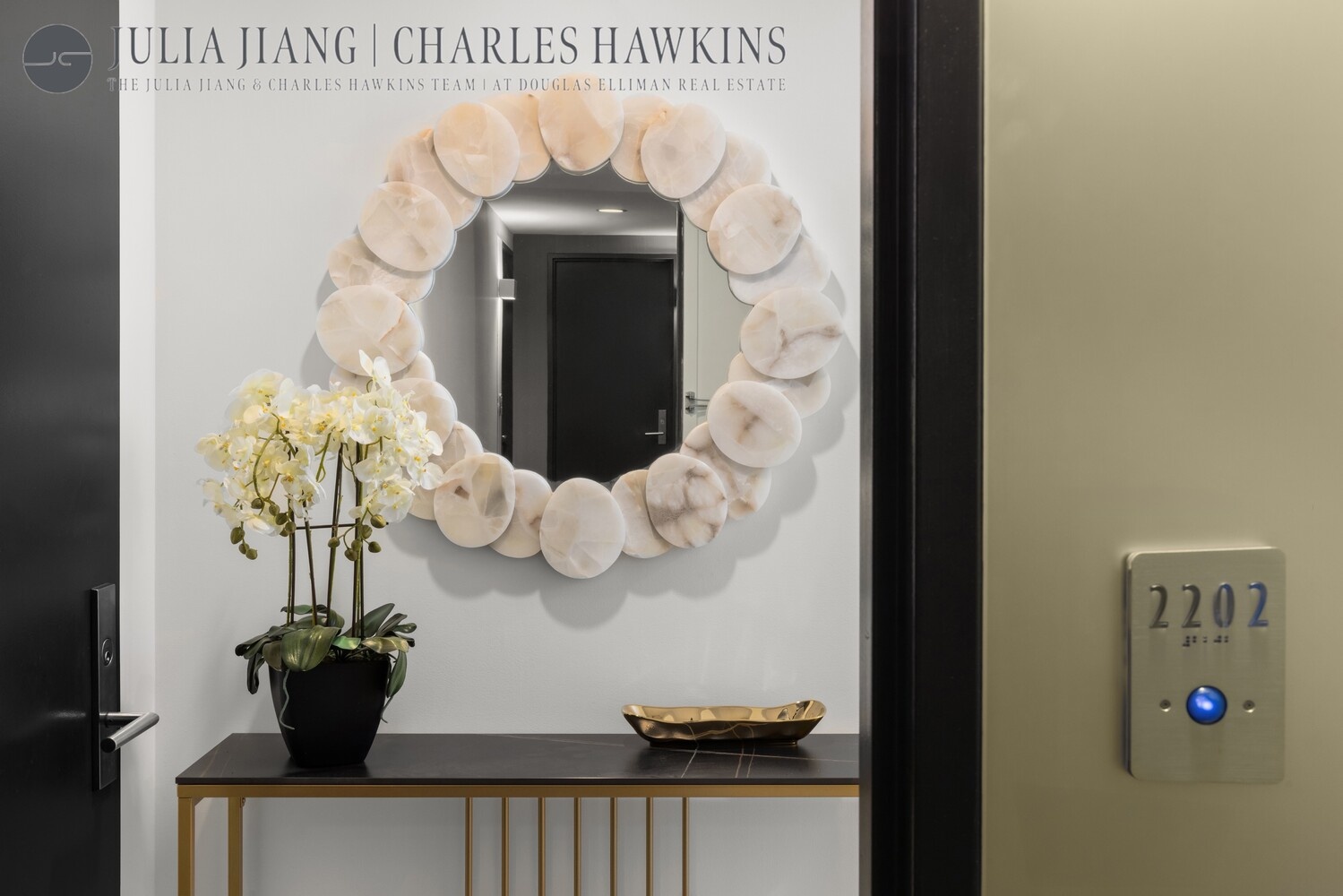 Residence 2202 is a bright and generously sized one-bedroom, one-and-a-half-bath Corner home, approx.999 SF with 9.5-foot ceilings and floor-to-ceiling windows facing south and west, flooding the home with sunlight throughout the day, casting a warm glow on the rich hardwood floors.