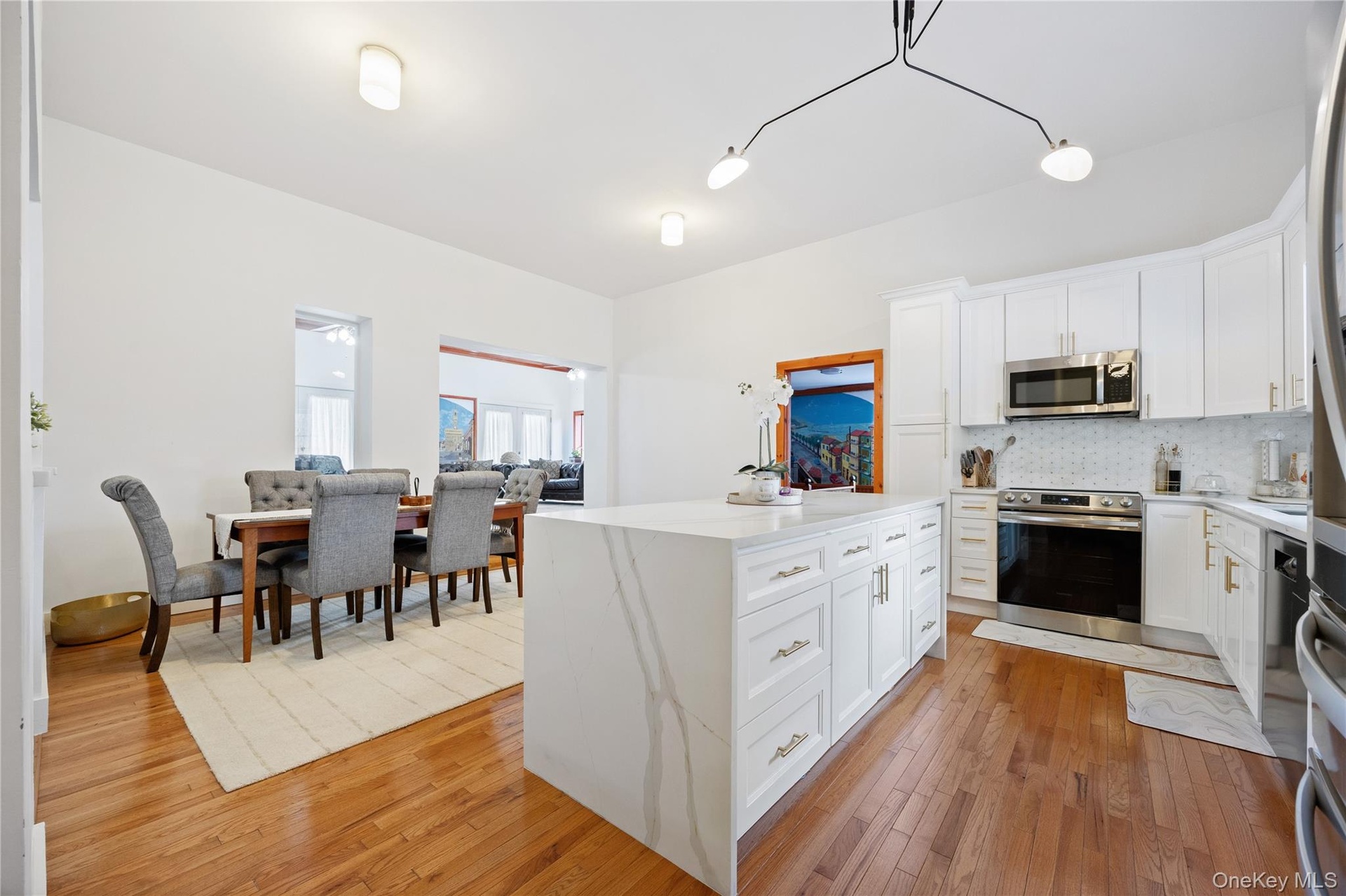 - Kitchen featuring stainless steel appliances, tasteful backsplash, light wood-type flooring, white cabinetry, and a kitchen island