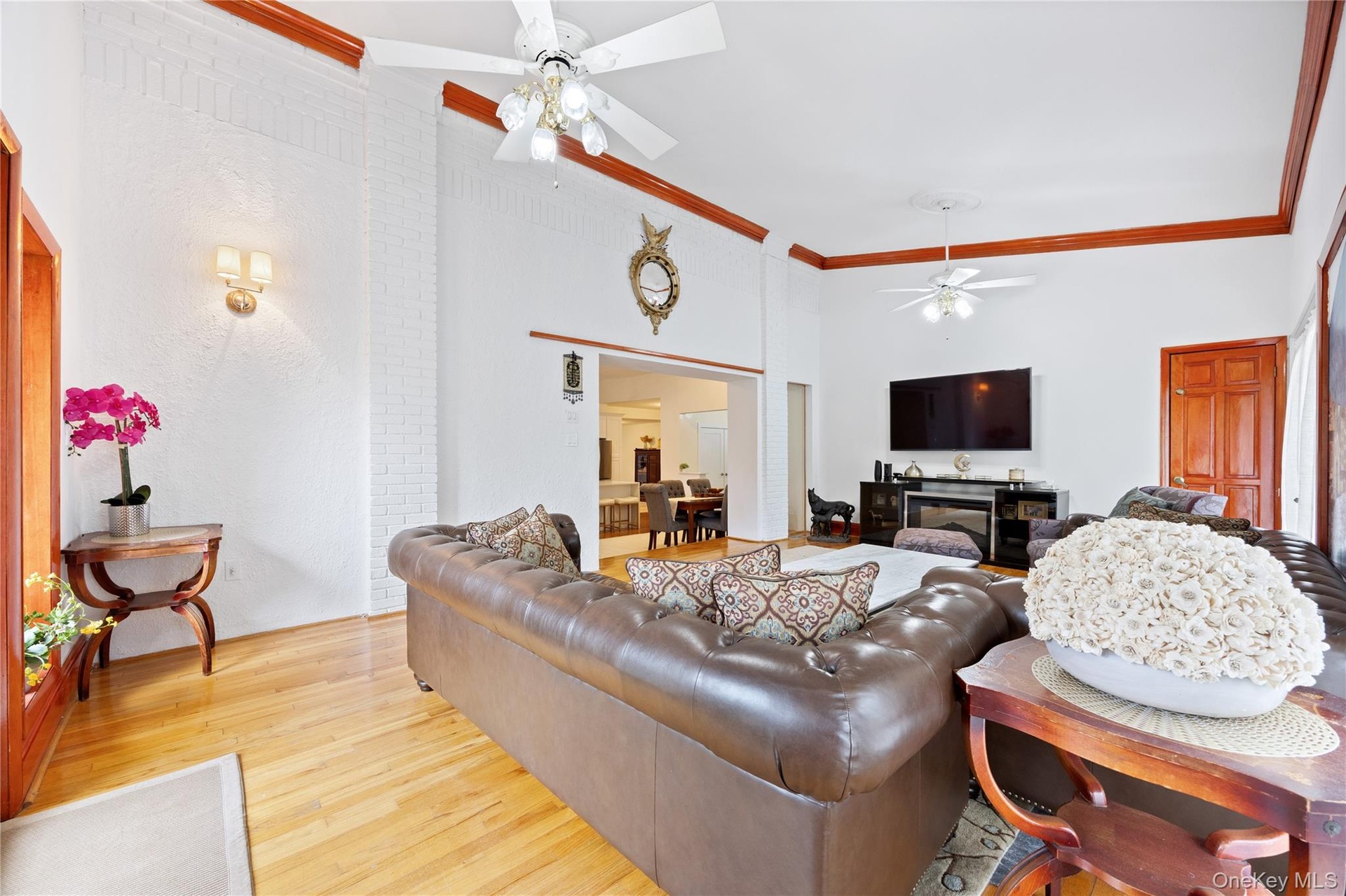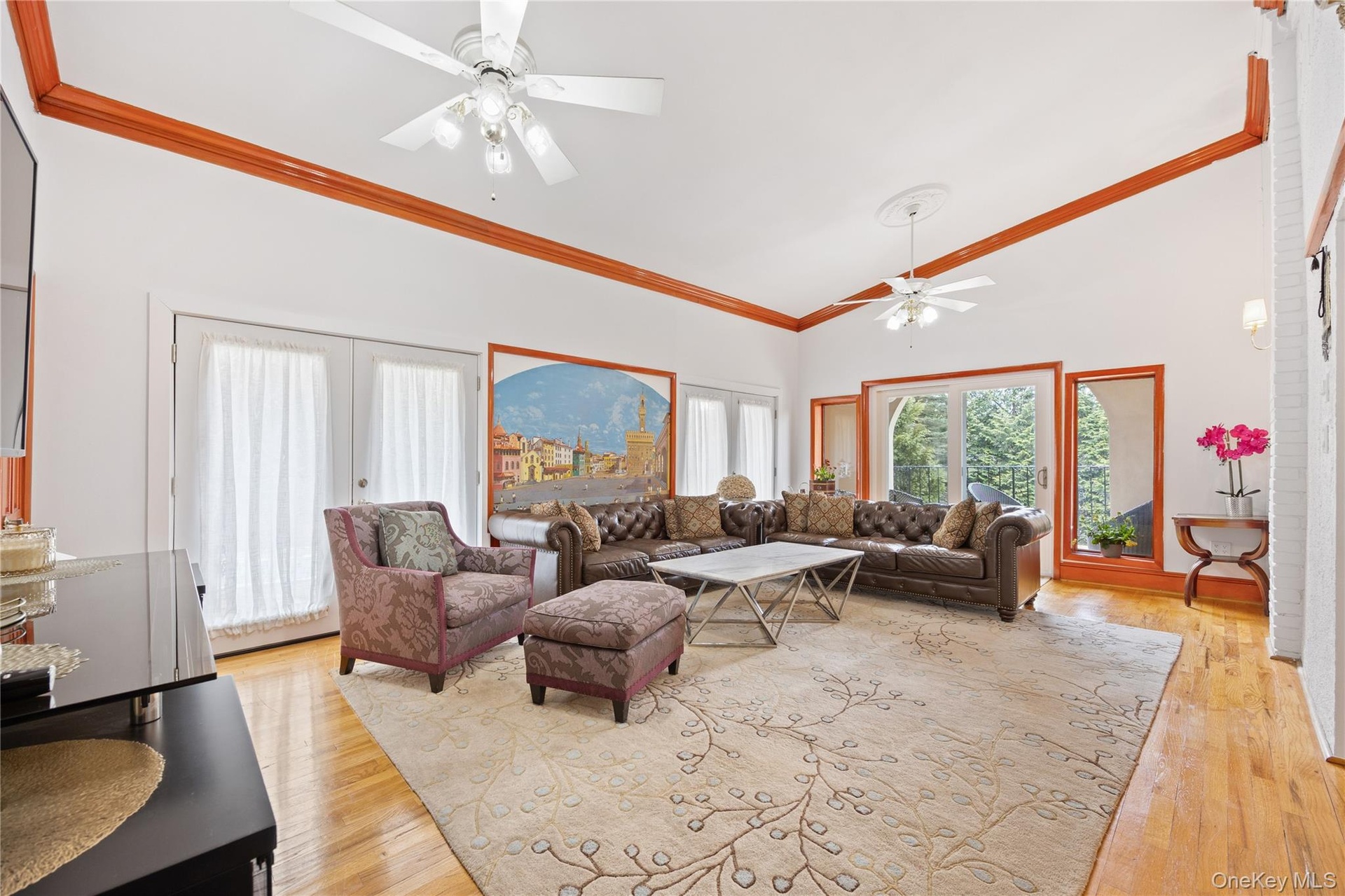 - Living area with high vaulted ceiling, ceiling fan, ornamental molding, and light wood finished floors