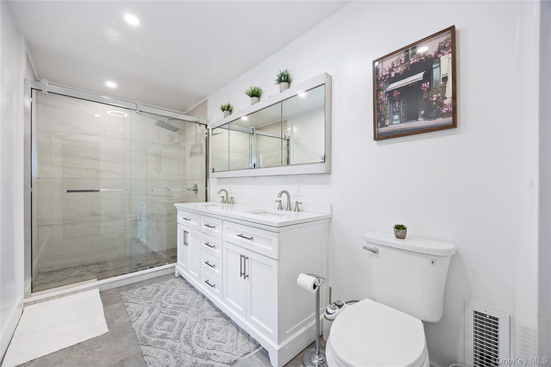 - Full bath with a sink, a stall shower, toilet, visible vents, and recessed lighting