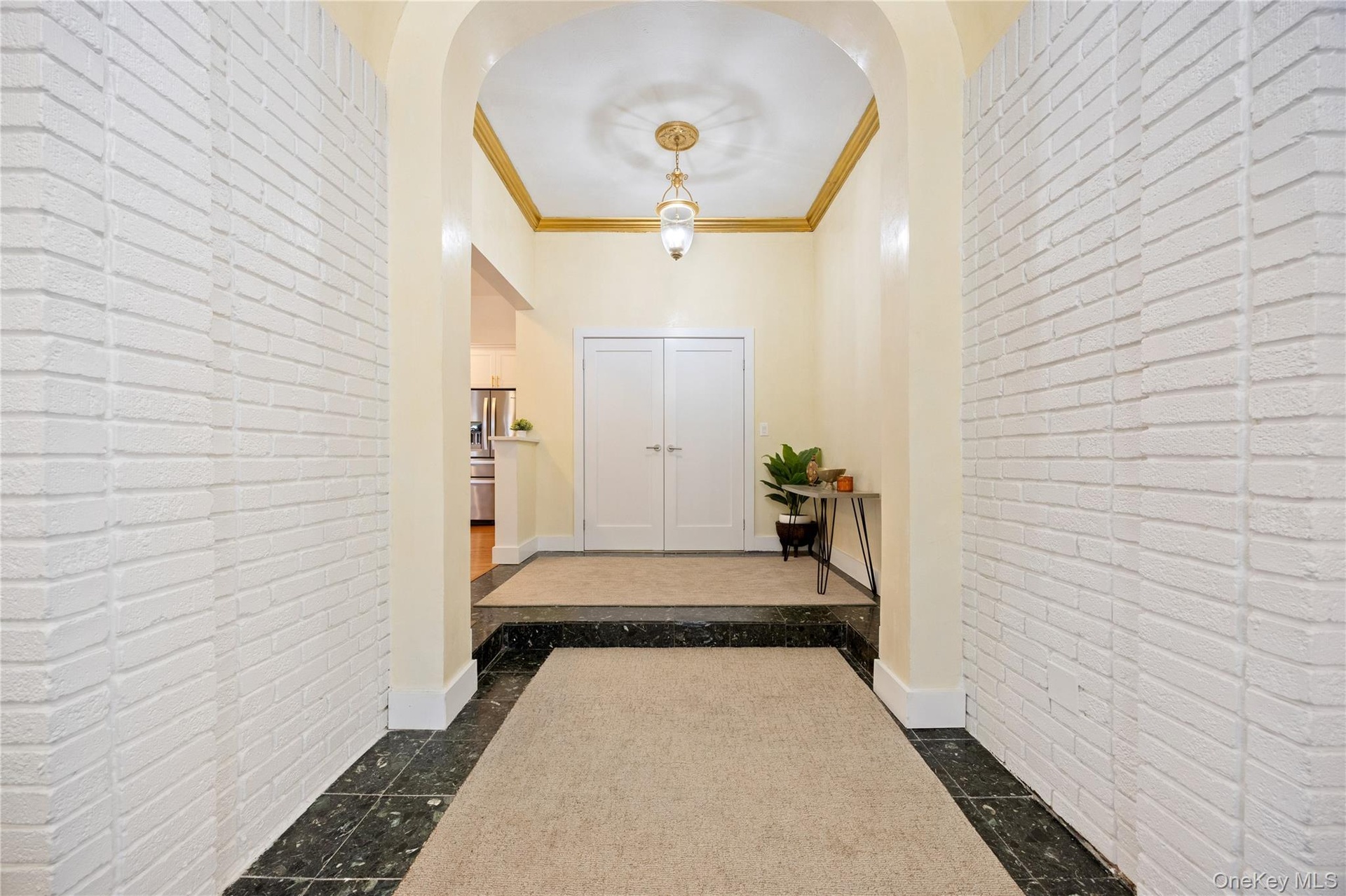 - Hall featuring arched walkways, brick wall, baseboards, and crown molding