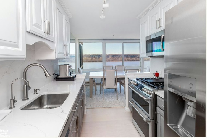 A wall of windows spanning the living and dining room magnificently frames the unobstructed views of the Hudson River, the Palisades and beyond.