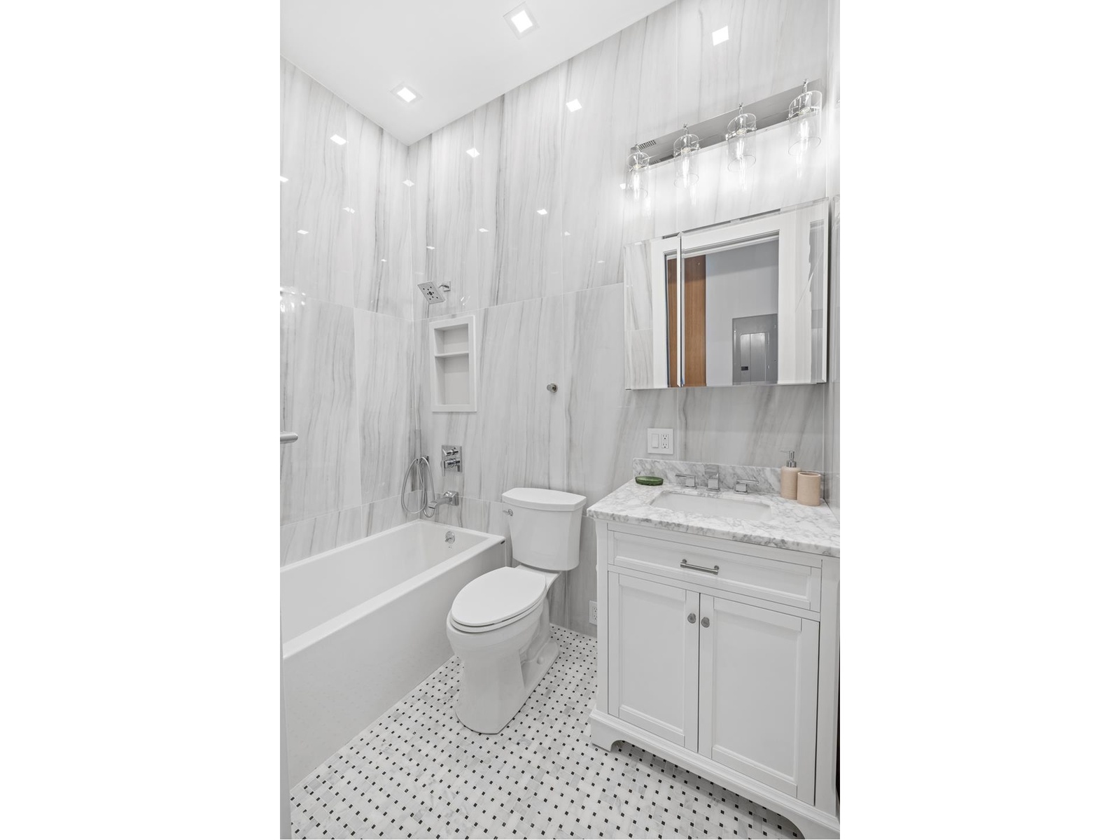The two full baths are gloriously pristine, with their ivory color palette and marble touches. The vanities provide extra storage, while the oversized soaking tub is as luxurious as it is inviting. The walk-in shower in the primary bathroom includes an oversized rain bath showerhead.