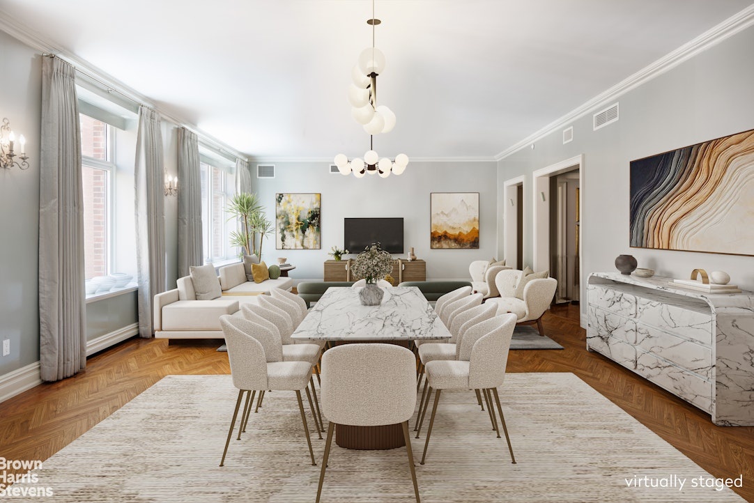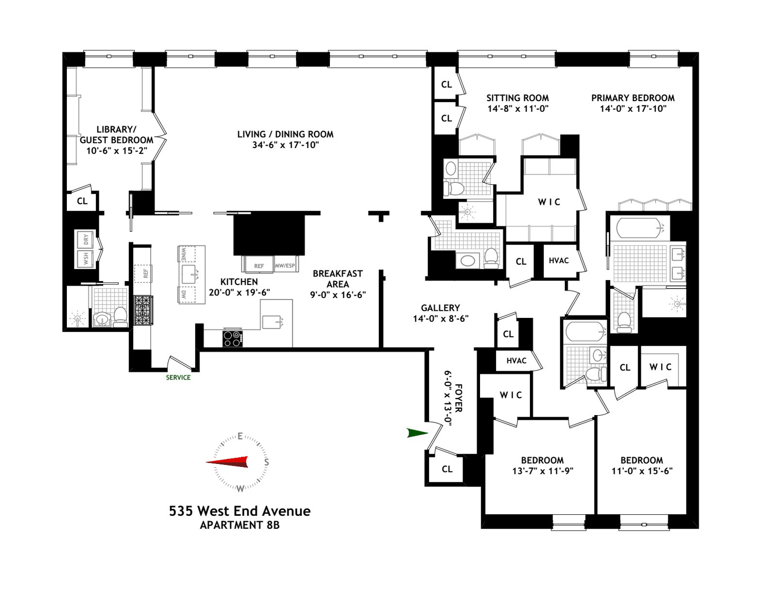 The formal entry gallery leads to a grand living room and dining room with enormous windows overlooking tree lined West End Avenue. The kitchen and library are both open to this rare and sumptuous living space, but also separated appropriately. The library can also be closed off and used as a 4/5th bedroom and has an en-suite bathroom.