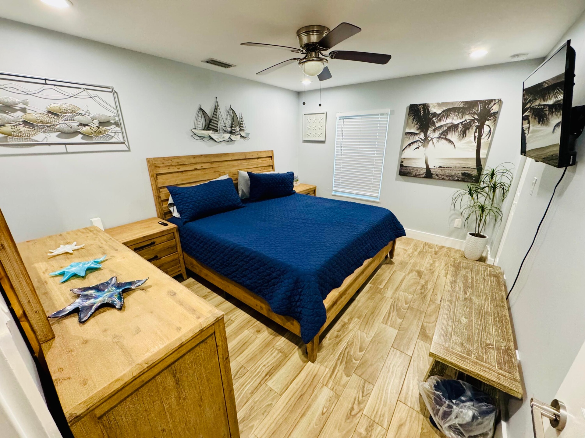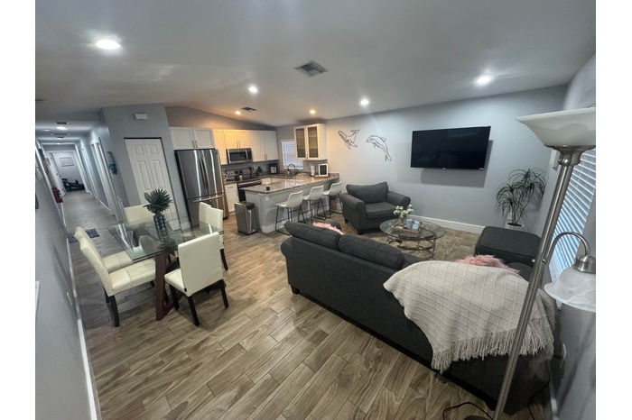 FEBRUARY MONTH AVAILABLE. . Built in 2019, this fully furnished 3 bedroom/2 bath home is perfect. Great indoor and outdoor space. It is fully fenced in case you' have furry family members. Property is painted in cool gray and decorated in beach decor. It is a long, narrow home with living and dining area towards the front and bedrooms and bathrooms down the hallway. Each bedroom has large walk-in closets. The master suite, which has its own bathroom, has door that leads to a beautiful outside patio that is fully fenced and well lit. The location can't be beat. Very close to beaches, downtown and golf course. Corner house, so lots of parking right by entrance. 2 king beds, 1 queen. PERFECT FOR RELOCATION, VACATION OR REMOTE WORK