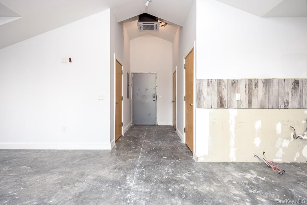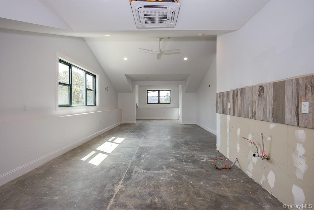 - Additional living space featuring baseboards, recessed lighting, vaulted ceiling, and unfinished concrete floors