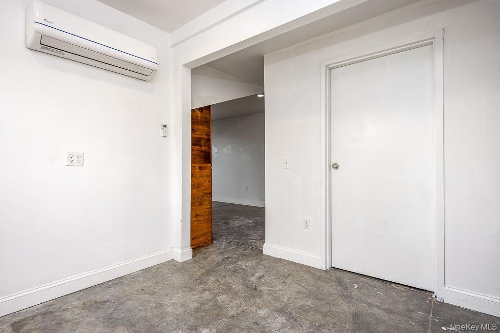 - Living area with a wall mounted air conditioner, recessed lighting, vaulted ceiling, and concrete flooring