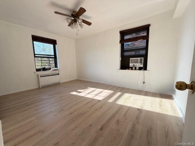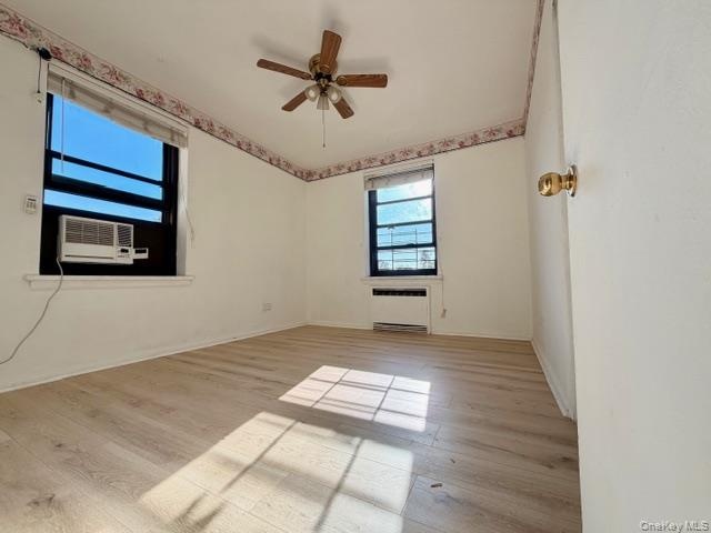 - WS Bedroom featuring ceiling fan, light wood-type flooring, and heating unit