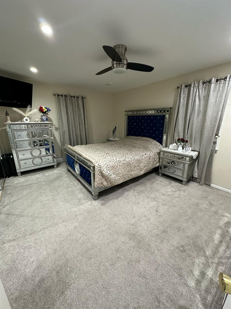- Bedroom featuring carpet floors, ceiling fan, and recessed lighting