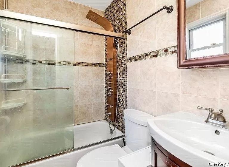 - Bathroom with toilet, tile walls, vanity, and bath / shower combo with glass door