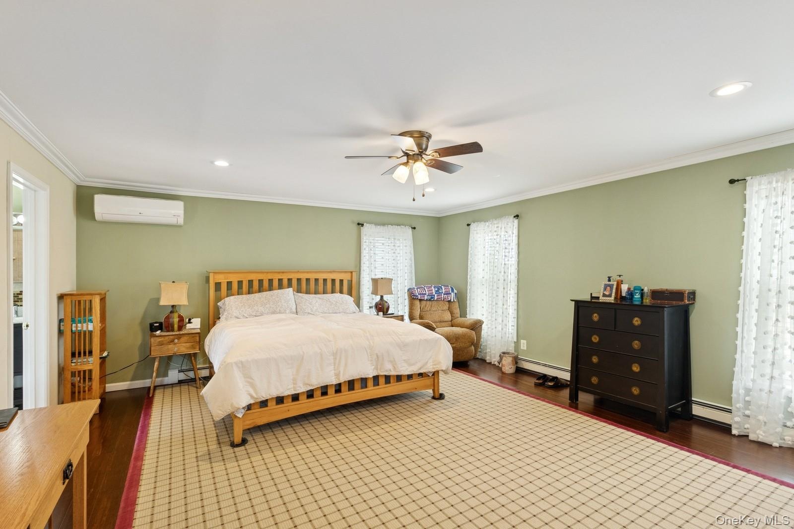 - Master Bedroom with baseboards, crown molding, wood finished floors, and a wall mounted AC