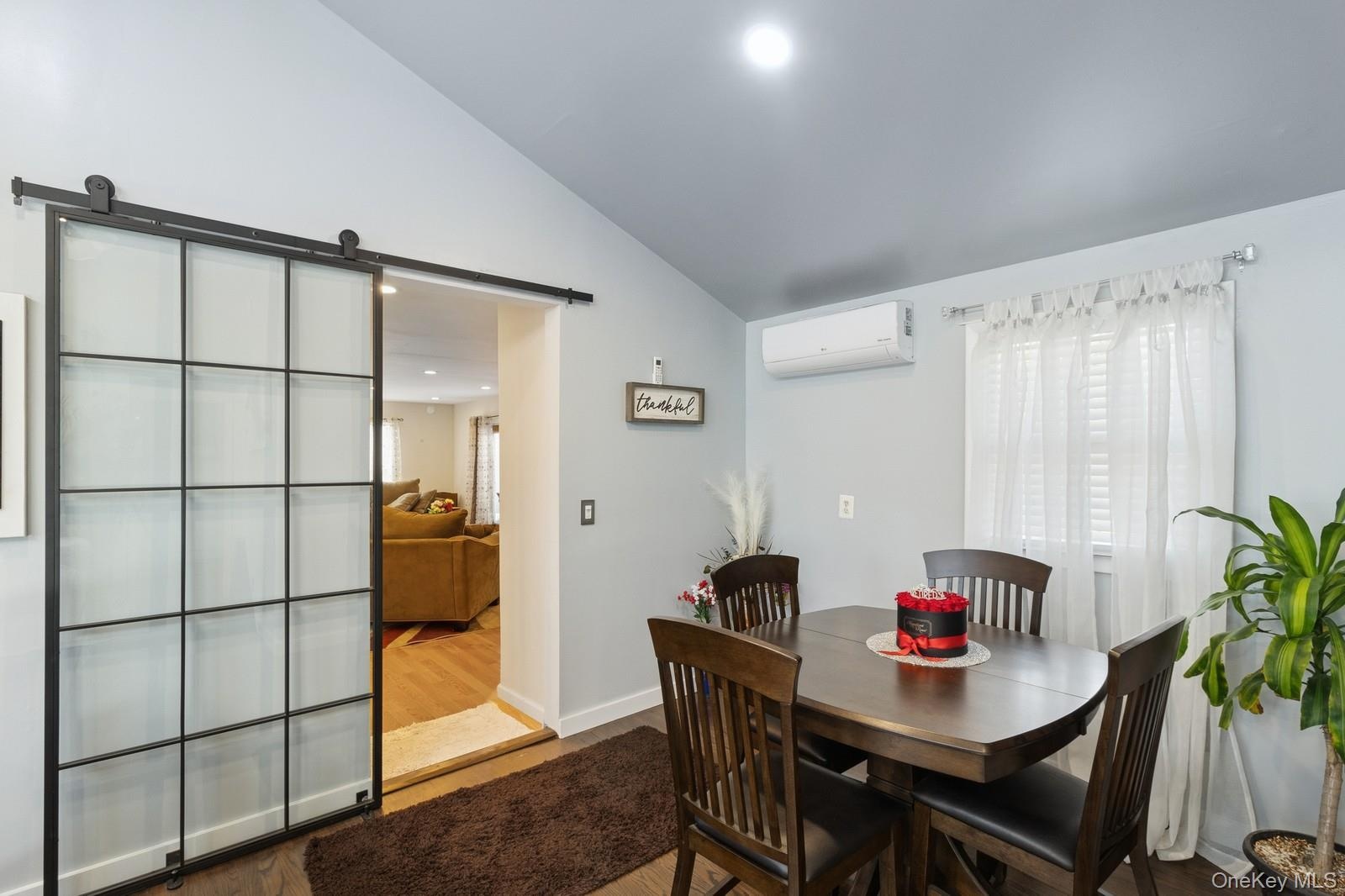 - Dining space with a barn door, vaulted ceiling, wood finished floors, an AC wall unit, and baseboards