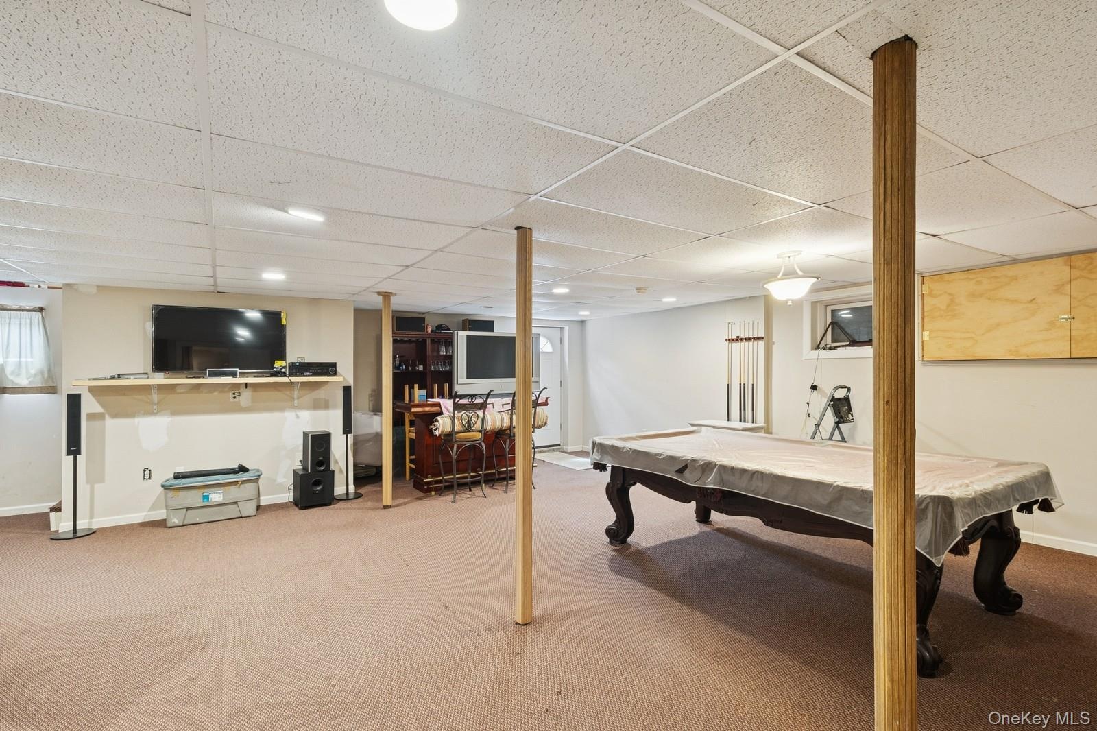 - Game room featuring washer and dryer, carpet flooring, a paneled ceiling, and billiards