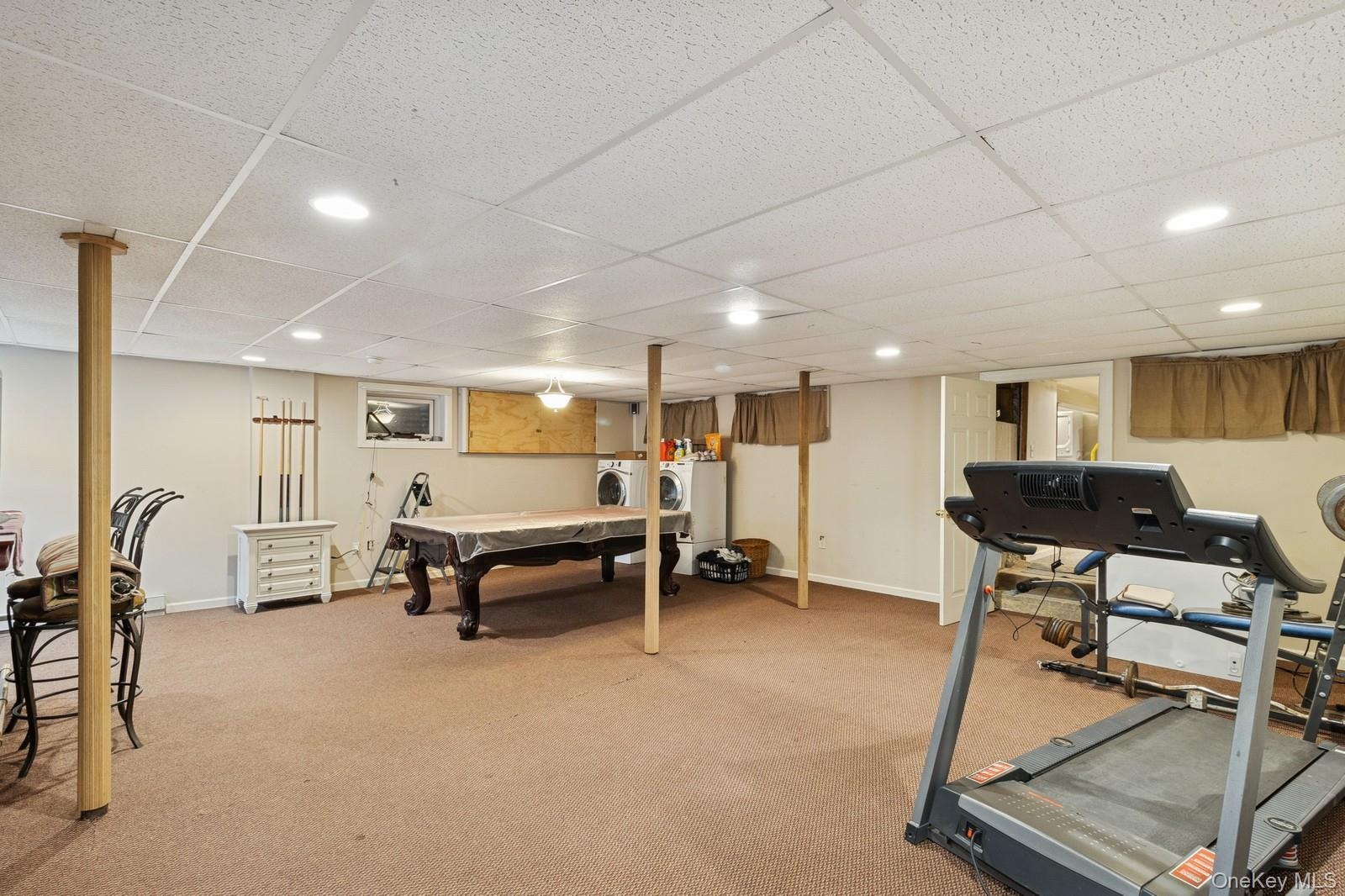 - Exercise room with baseboards, recessed lighting, light colored carpet, independent washer and dryer, and billiards
