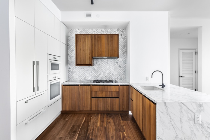 Residence 31E is the largest of the two bedroom lines at the Greenpoint. This spacious 1,288 square foot residence faces east and features a well-proportioned layout, desirable split bedrooms and generous closet space. This residence has ceiling heights of nearly 10 feet and floor to ceiling windows which allow for an openness unmatched throughout this incredible Brooklyn neighborhood. The wide plank walnut floors highlight a palate of natural materials and the open kitchen with a breakfast bar is outfitted with a honed Statuario marble countertop and backsplash alongside a premium Miele appliance package including gas cook-top and double wall ovens. The master bathroom offers a double walnut vanity with matte black fixtures and an oversized stall shower.