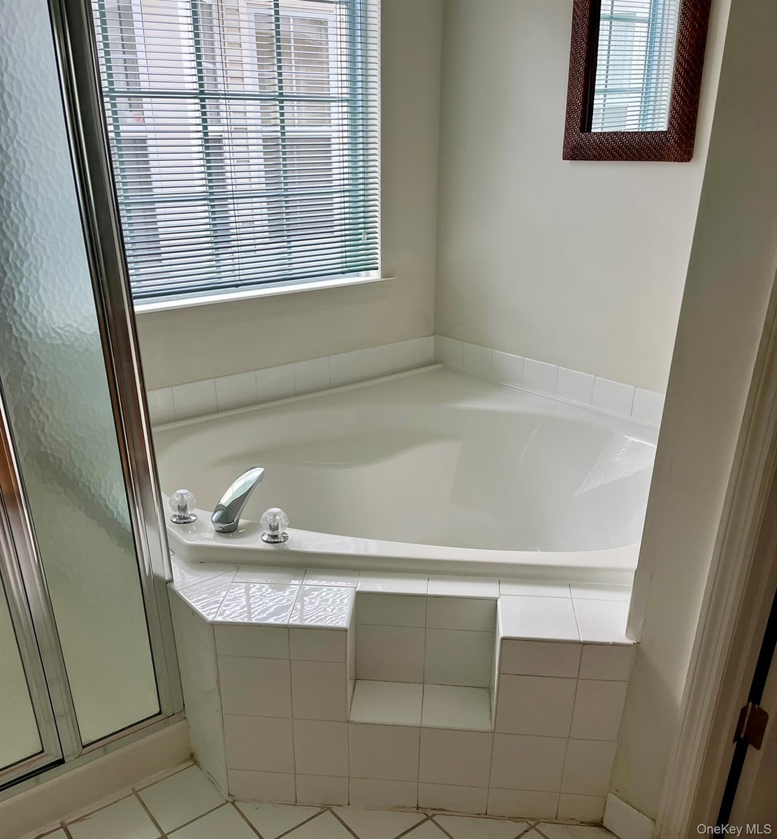 - Bathroom featuring tile patterned flooring, a stall shower, and a bath