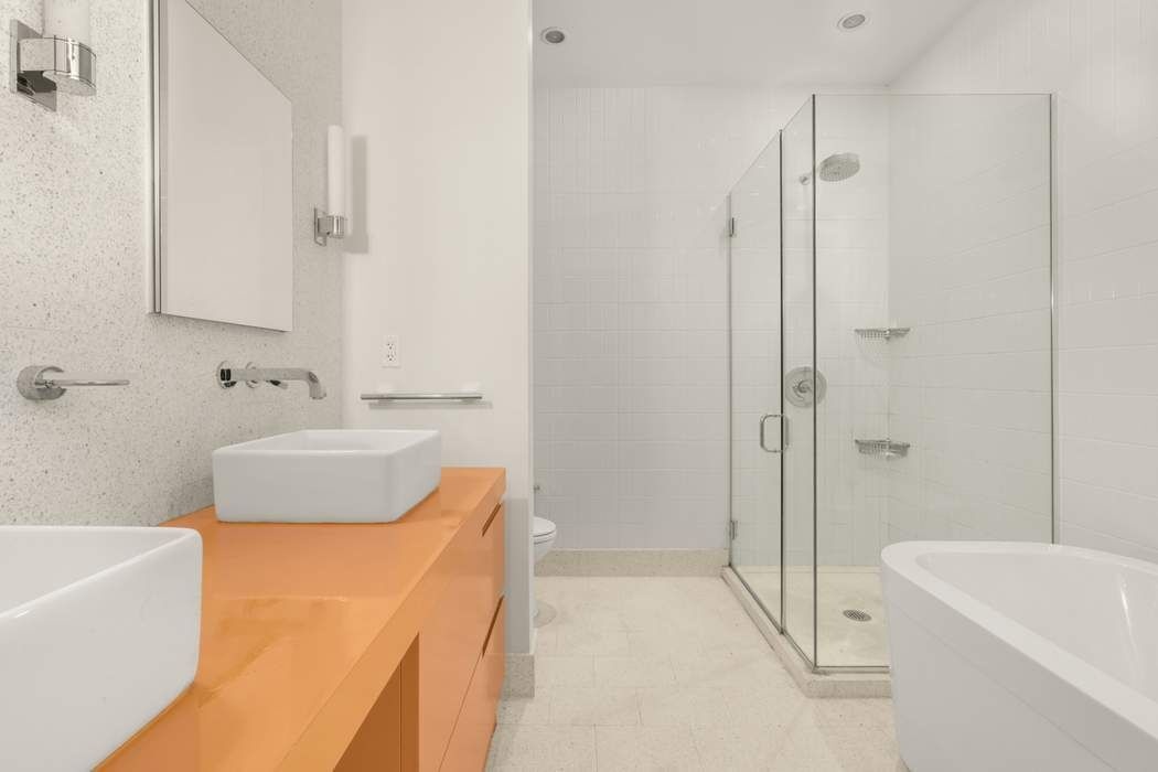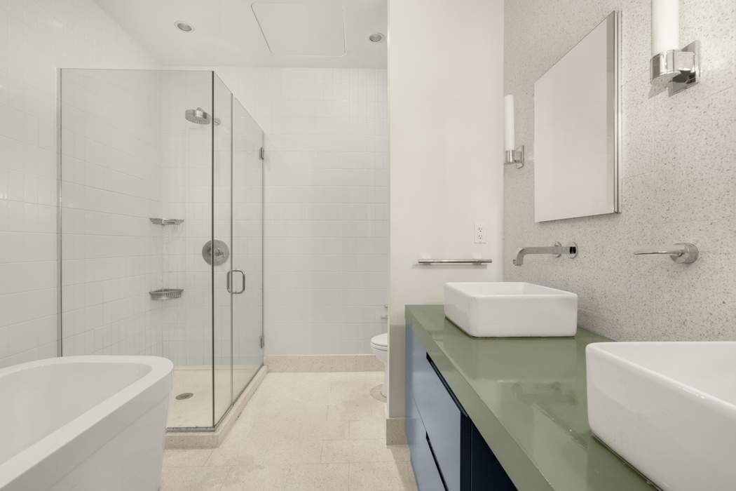 The open chef’s kitchen is equipped with custom fixtures from DADA, a terrazzo countertop, and top-of-the-line Bosch appliances, including a four-burner cooktop, microwave, and dishwasher. Additionally, a sleek built-in Sub-Zero refrigerator enhances the chef's kitchen’s modern design.