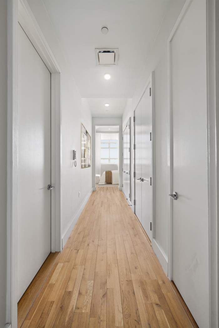 As you enter the primary bedroom, you will be struck by its massive size. This sun-drenched bedroom features multiple closets and a separate area that can be used as a home office, sitting area, or lounge. The long galley hallway leads you to where the second entrance of the home is located. This space can easily be configured into a dressing area and a large walk-in closet. The en-suite primary bathroom features high-end finishes, including a double vanity with built-in storage, a freestanding tub, and a separate glass-enclosed shower. The massive nature of this bedroom allows you to create two true generously sized bedrooms.