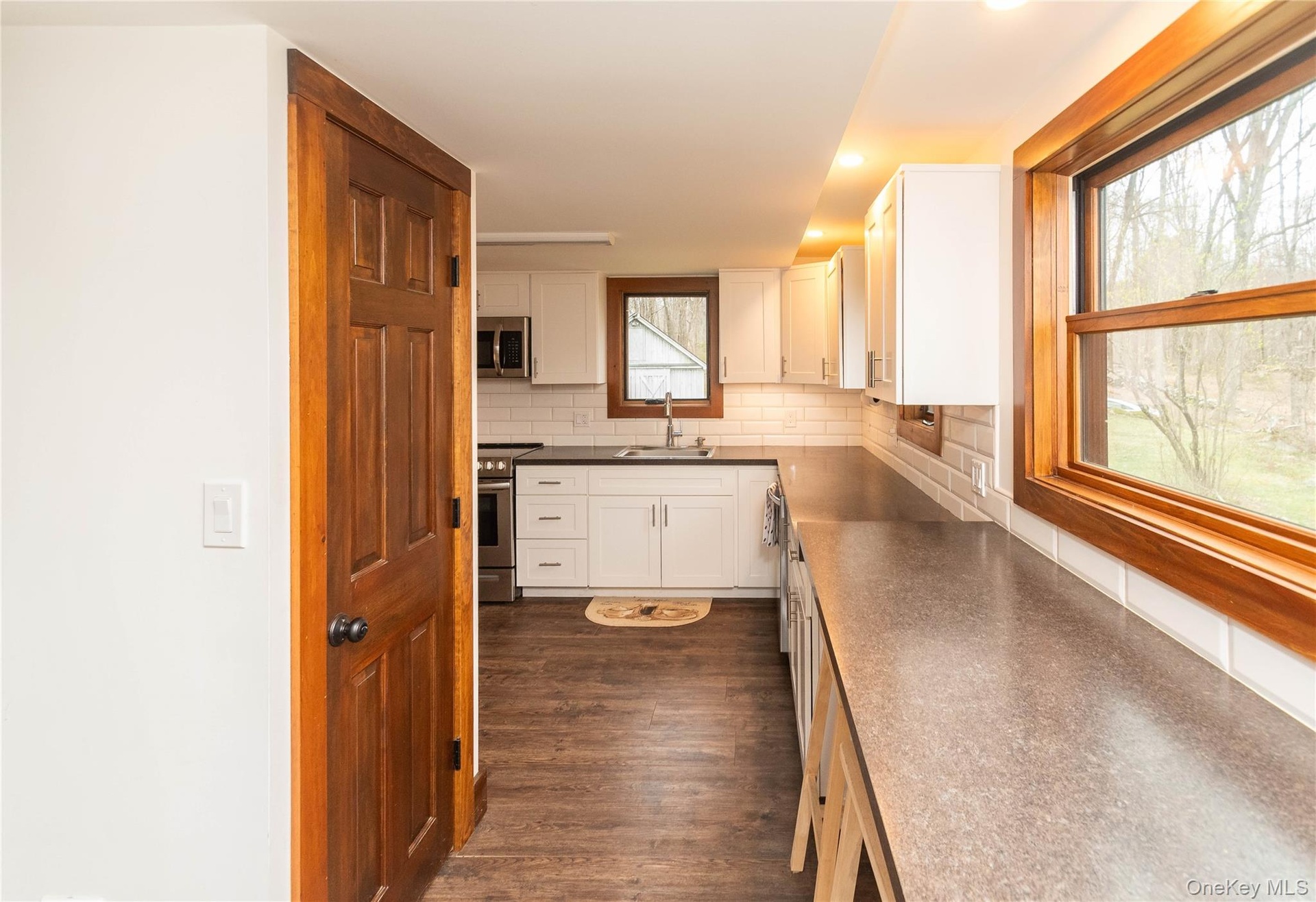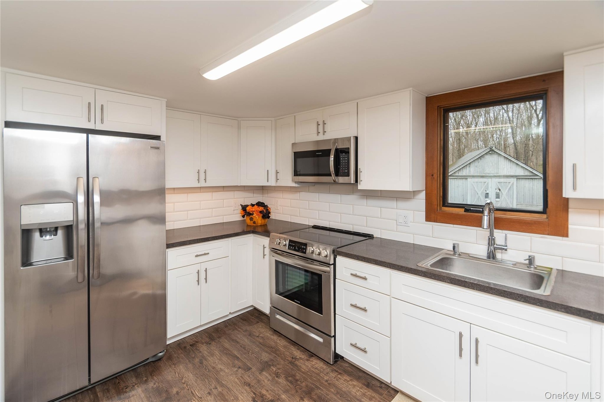 - Kitchen with white cabinets, dark countertops, stainless steel appliances, and a sink