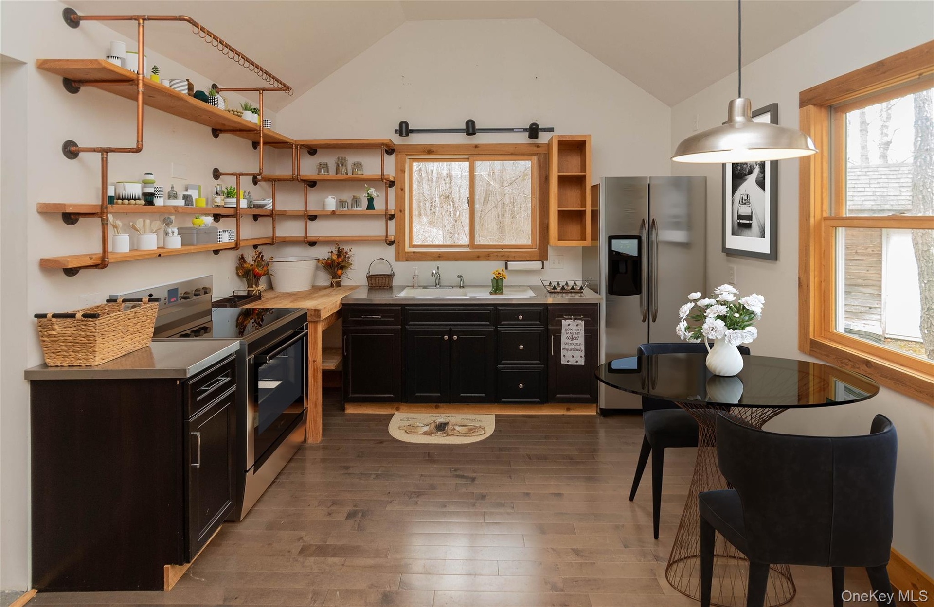 - cabin Kitchen featuring open shelves, vaulted ceiling, and wood-type flooring