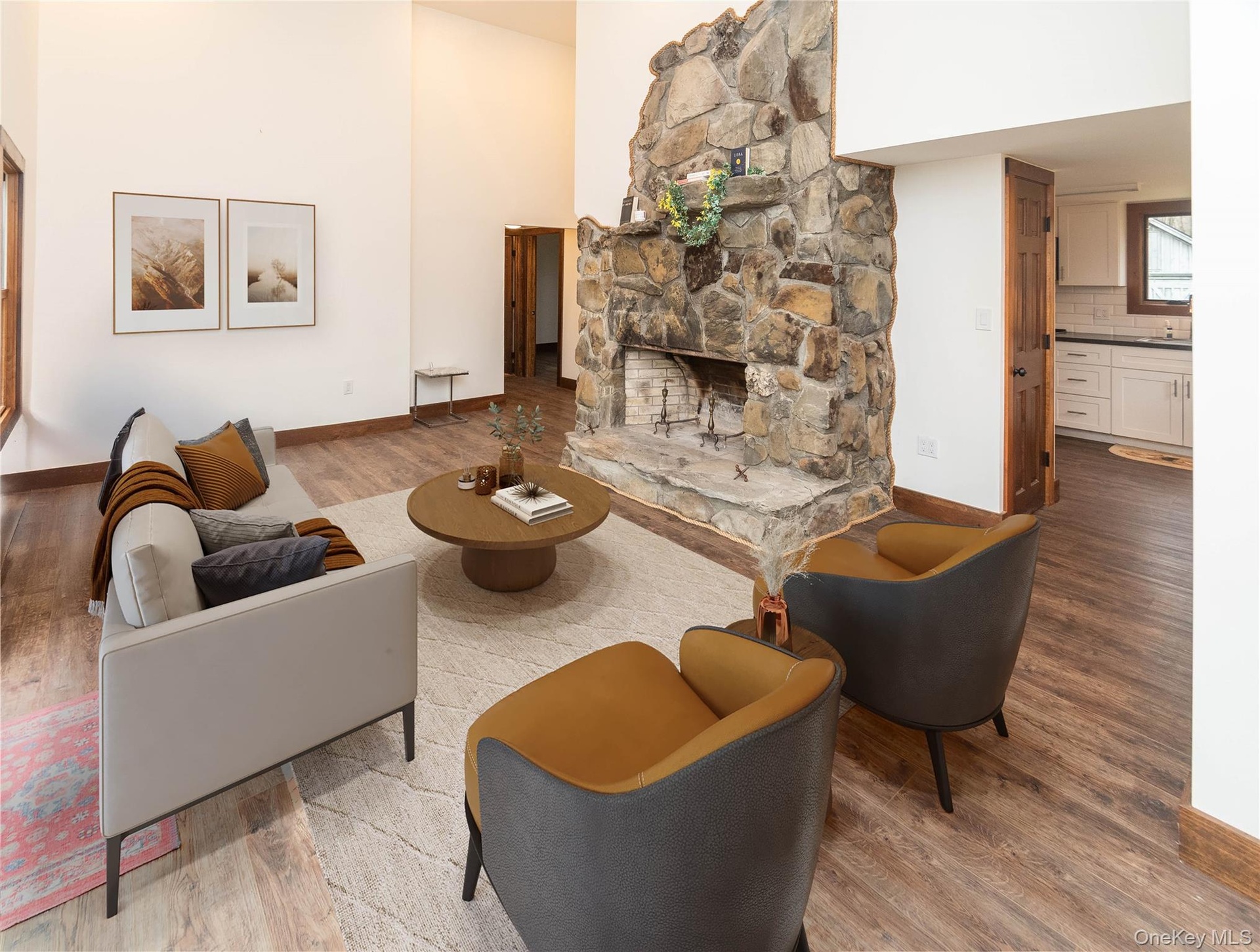 - Living room with high vaulted ceiling, fireplace and wood finished floors