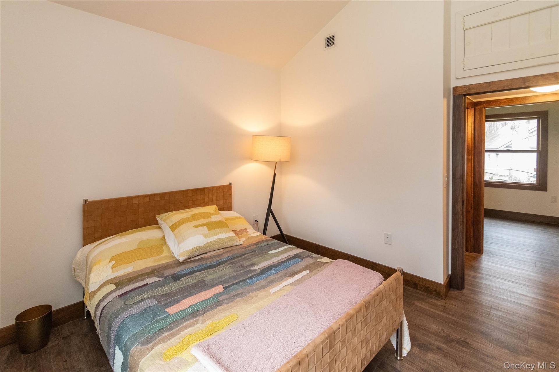 - Bedroom featuring lofted ceiling, wood finished floors