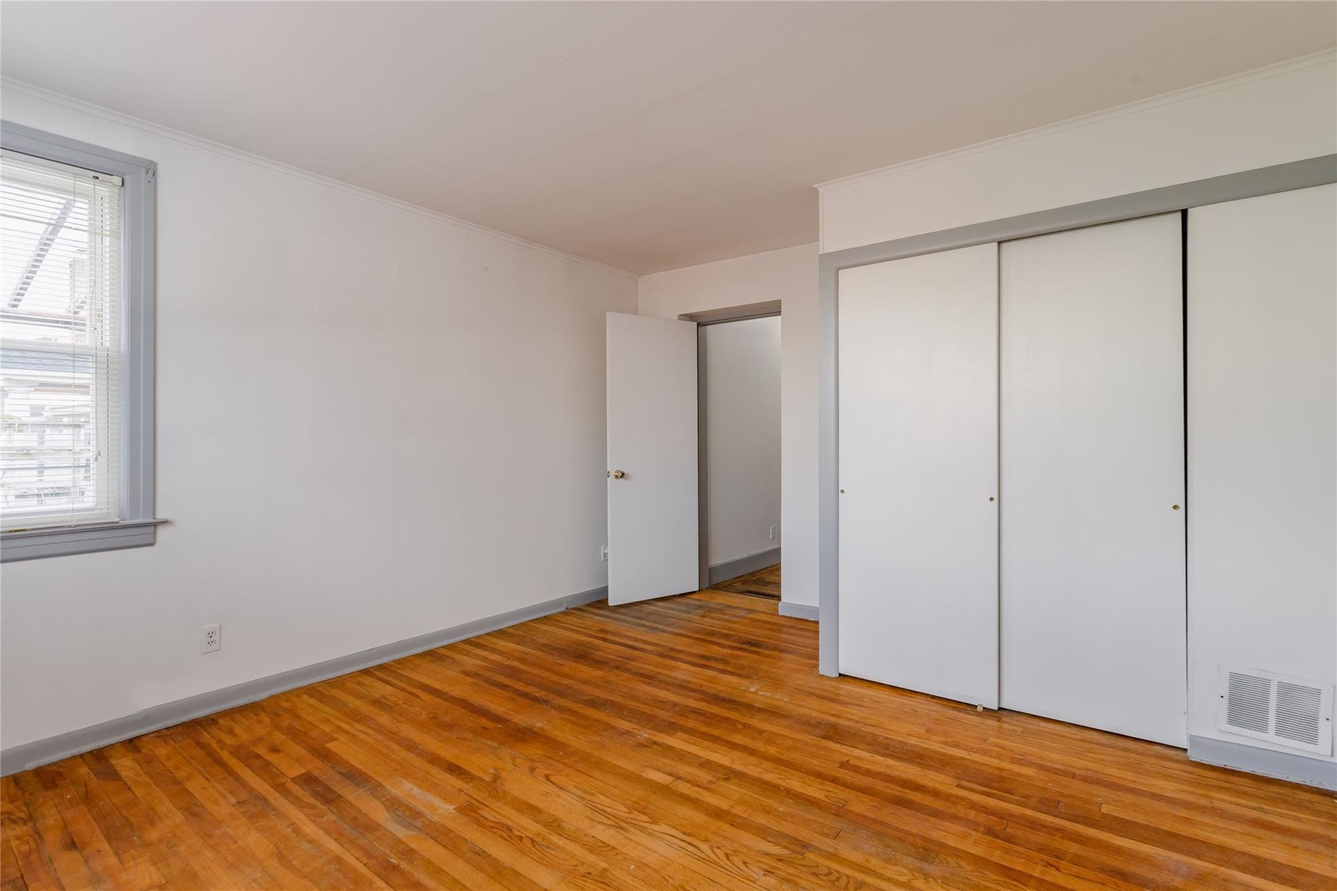- Unfurnished bedroom with light wood-style floors, visible vents, a closet, and multiple windows