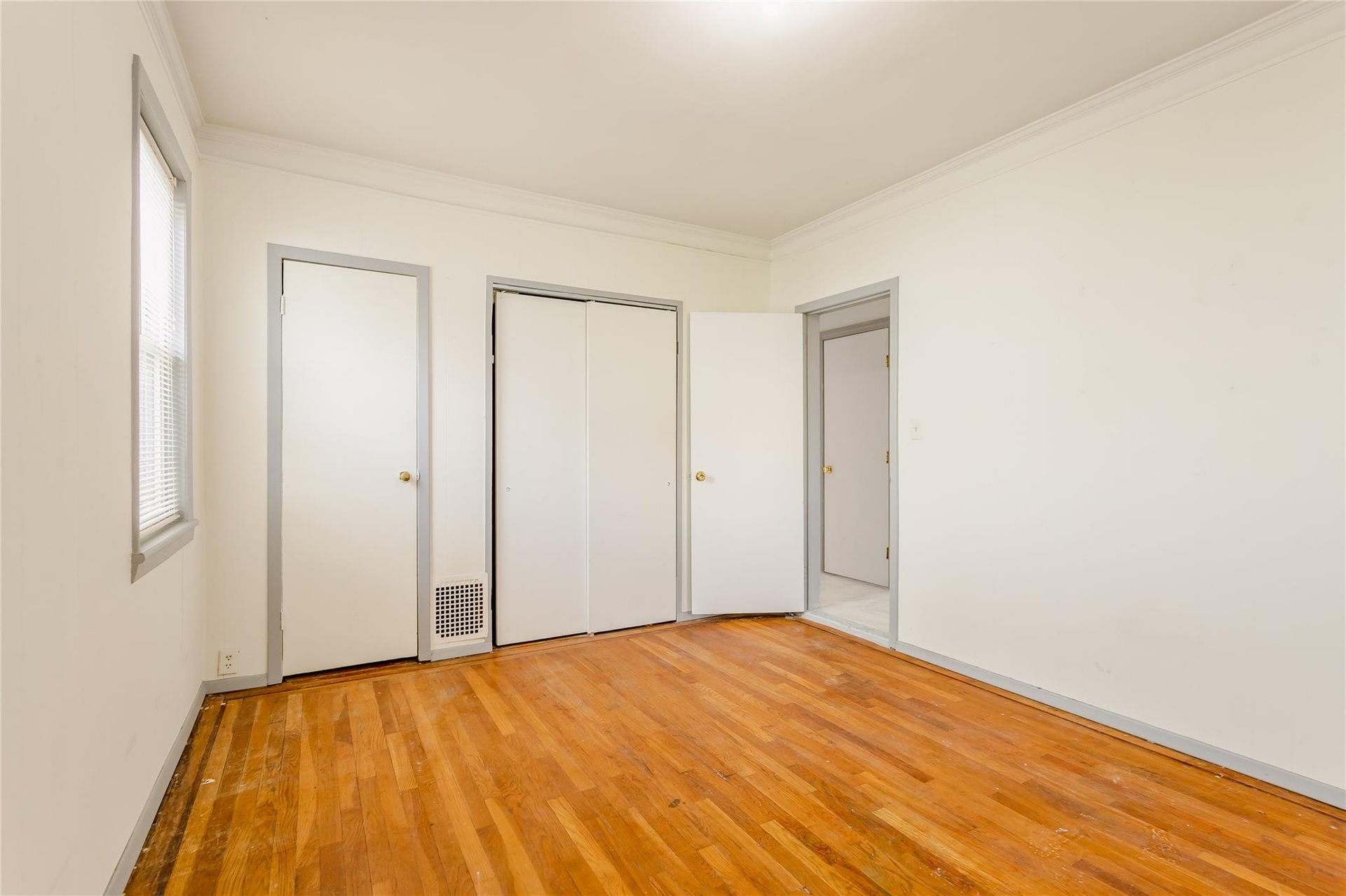 - Unfurnished bedroom with light wood-style floors, visible vents, and crown molding