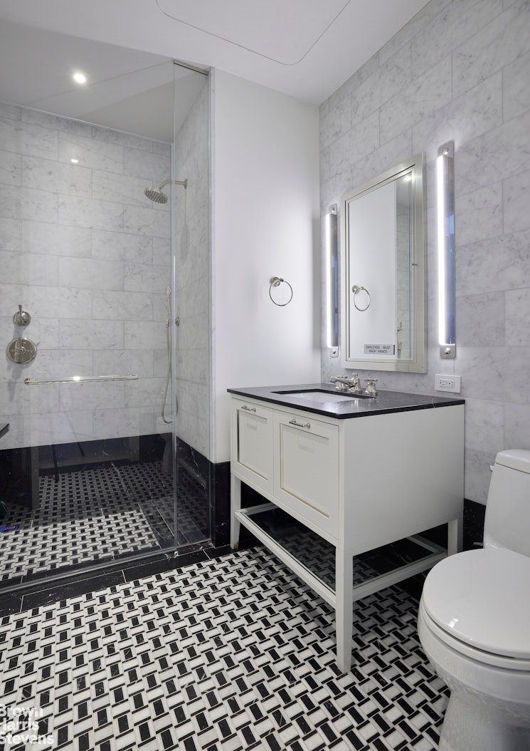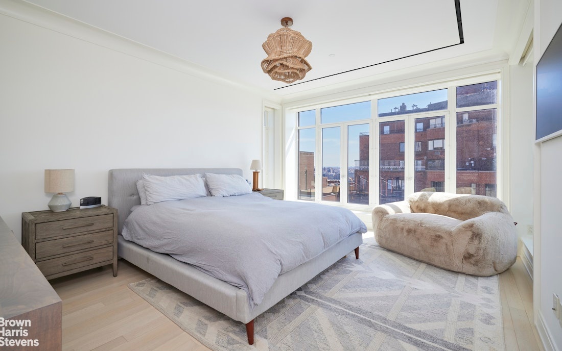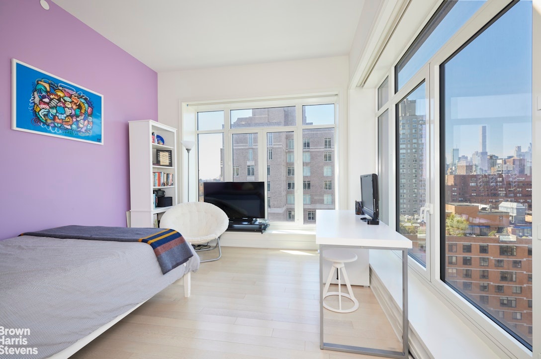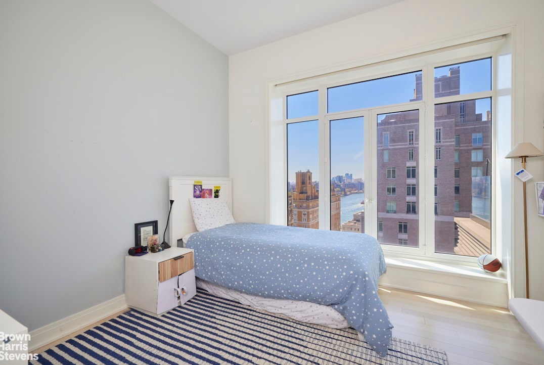 The primary suite is a serene sanctuary, complete with a private sitting area which could serve as a "corner" office with two exposures, large walk-in closet, and breathtaking views of the East River and Midtown skyline. The spa-like en-suite bathroom is appointed with fluted mirrored glass, a custom Italian vanity, Waterworks Henry polished nickel fixtures, a deep soaking tub, walk-in shower, and radiant heated floors for ultimate comfort. Three other bedrooms complete the home. On the first floor, a deeded storage room conveys with the apartment.