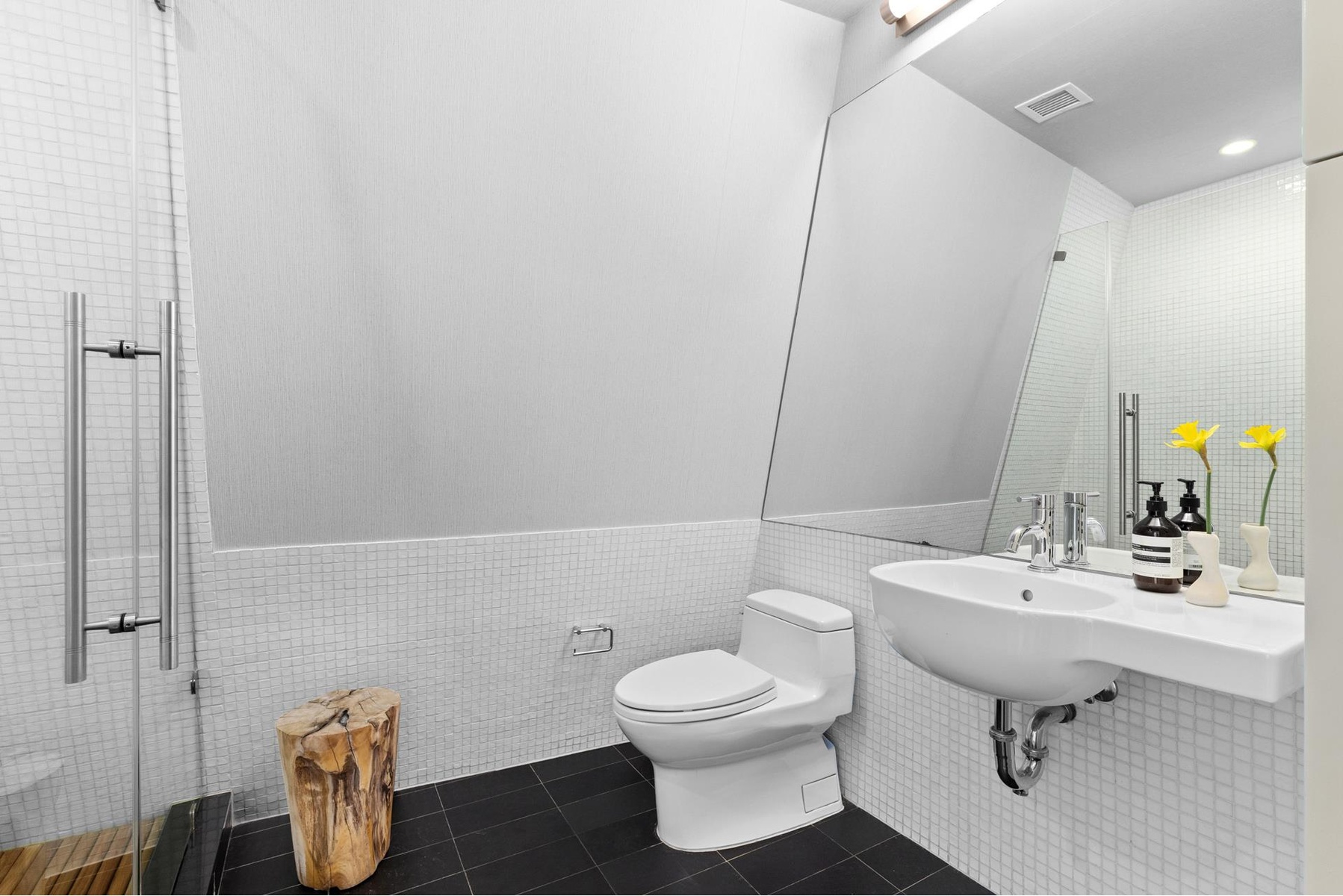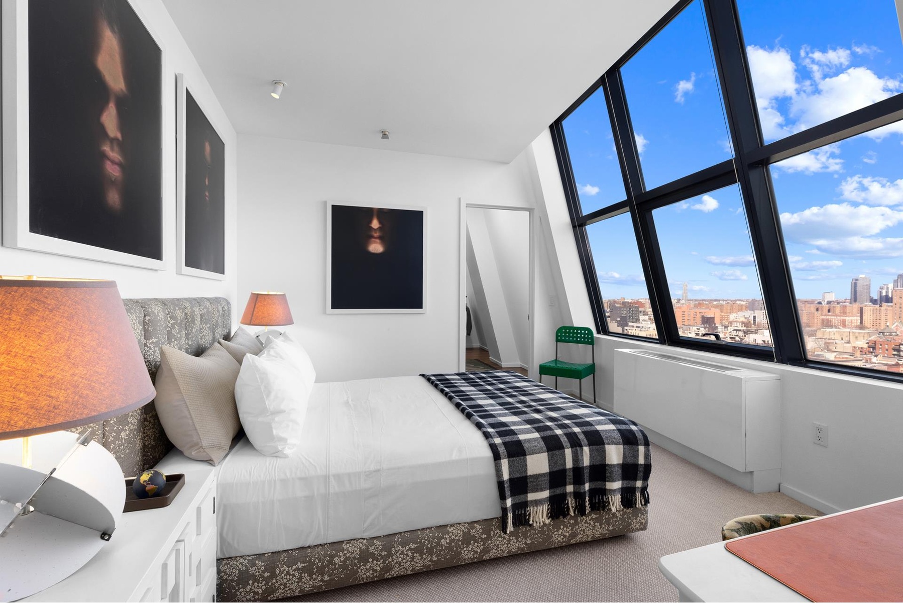 Additional apartment features include privacy-tinted pixelated glass windows in every room, 2.5-inch white oak floors, multi-zoned PTAC AC, stacked washer/dryer, Sonos sound system, custom blinds throughout, and a handsome slate-tile private landing.