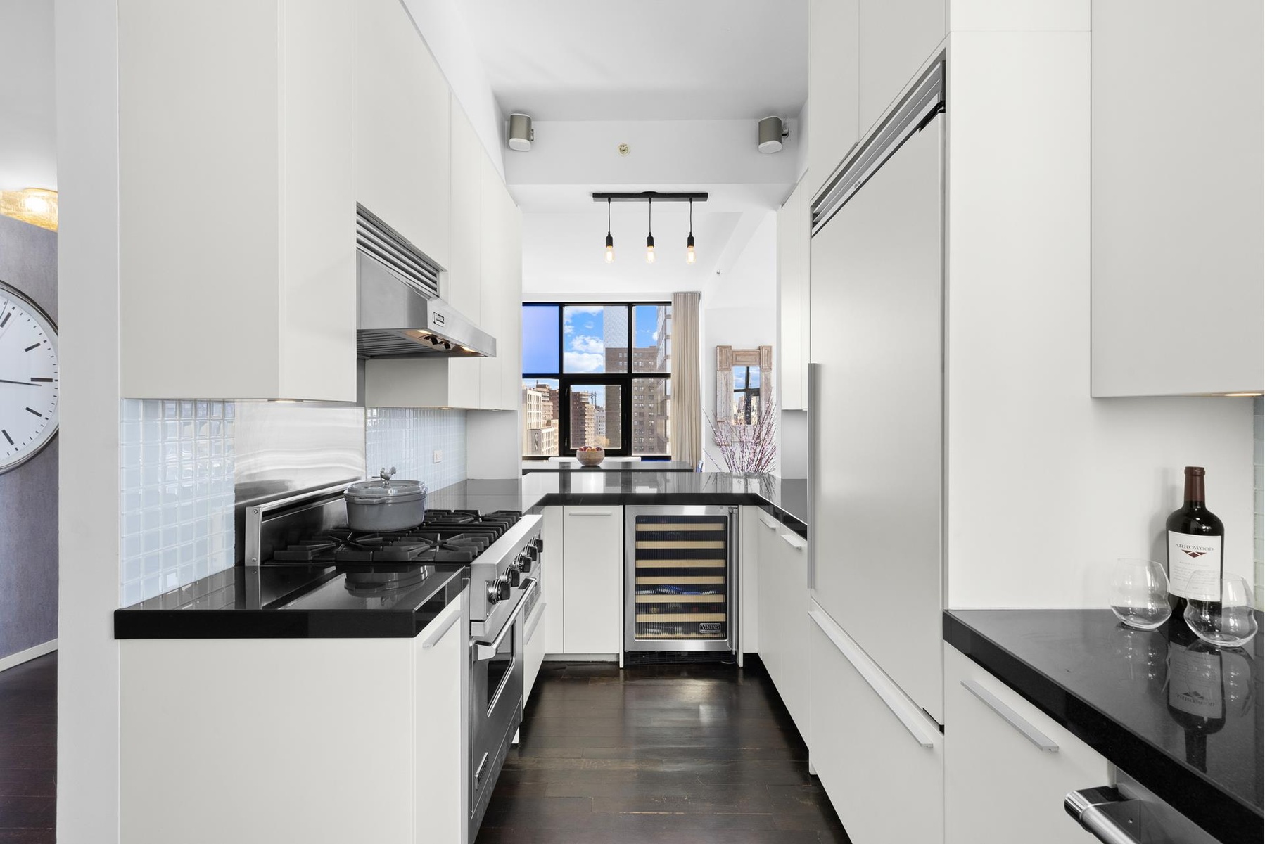 The generously sized entertainment area includes a spacious living room and open dining area, which comfortably seats 10. Adjacent to the entertainment space, you'll find a top-of-the-line open windowed chef's kitchen equipped with Viking appliances, granite countertops, Boffi cabinetry, wine fridge, and dining bar.