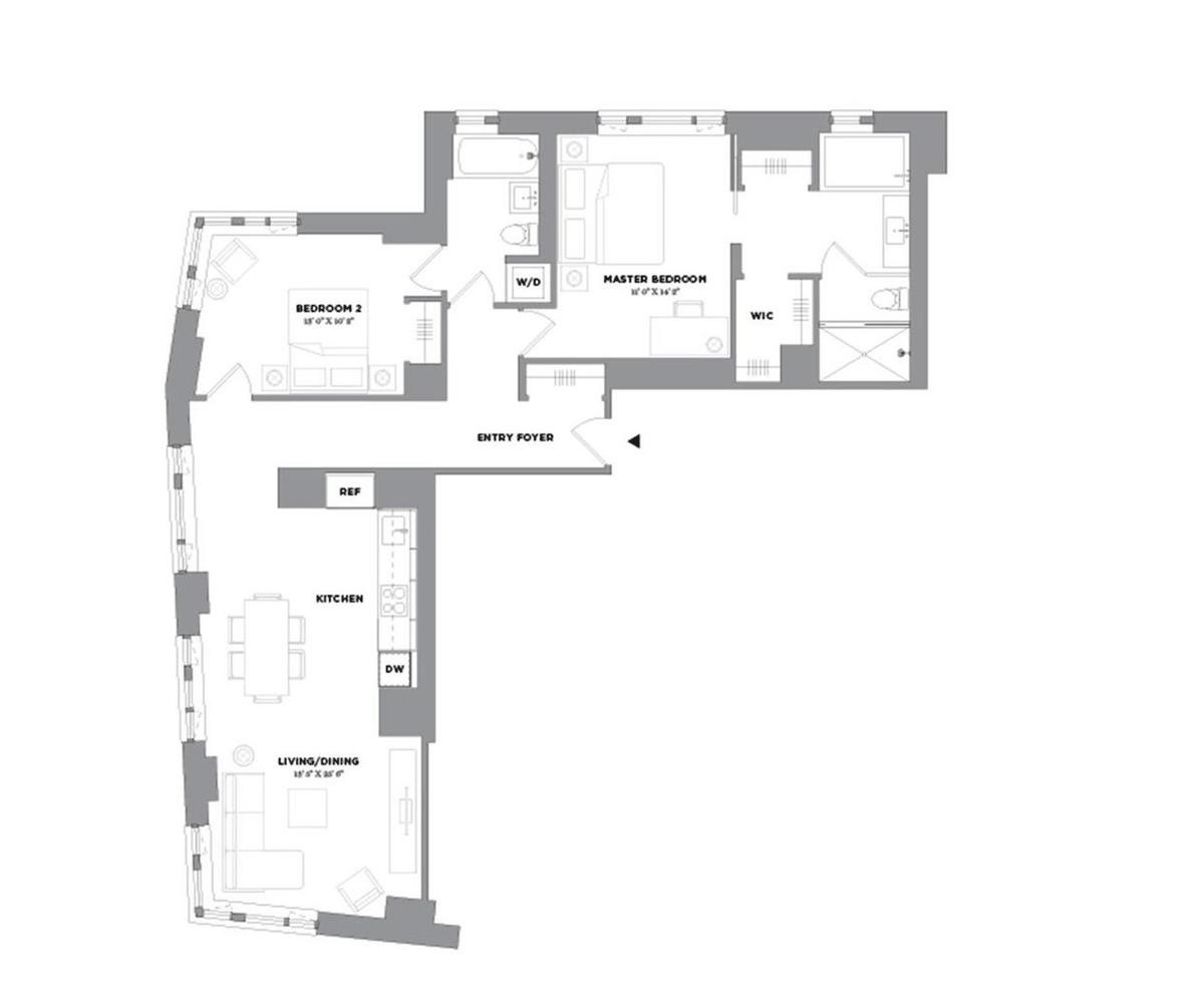 This modern 2 bedroom, 2 bathroom residence with south eastern exposure fills the apartment with natural sunlight! The long Entry Foyer leads to a spacious Living/Dining Room with a wraparound wall of windows facing south and west. The open chef's kitchen boasts custom designed cabinetry, Caeserstone counter and high-end appliances. The large Master Bedroom suite offers stunning views and double closets. The master bathroom includes custom deep soaking tub, a separate rain shower and a large dressing area as part of the bedroom suite. Residents of 15 William Street have access to an unparalleled set of amenities including 24-hour attended lobby, Penthouse Sky Lounge/Terrace, children's playroom, fitness center, yoga-Pilates studio, quash court, 50 ft. lap pool, half basketball court, sauna and valet parking.