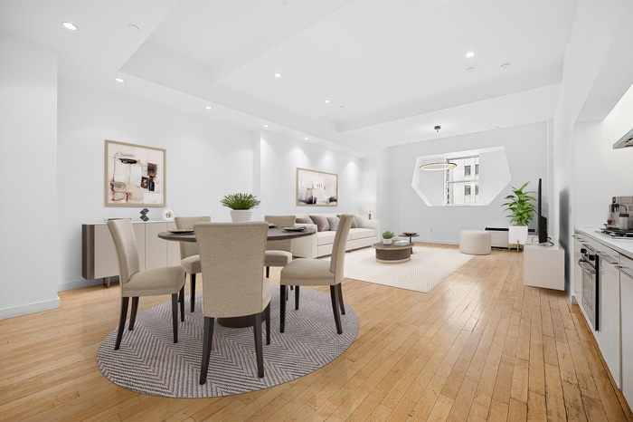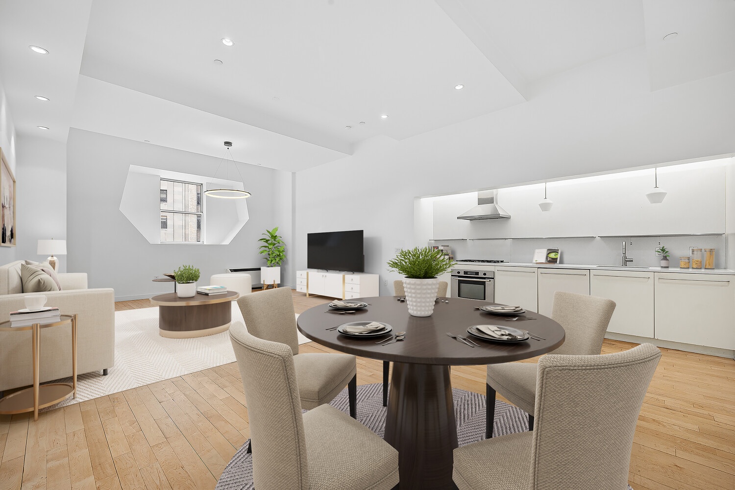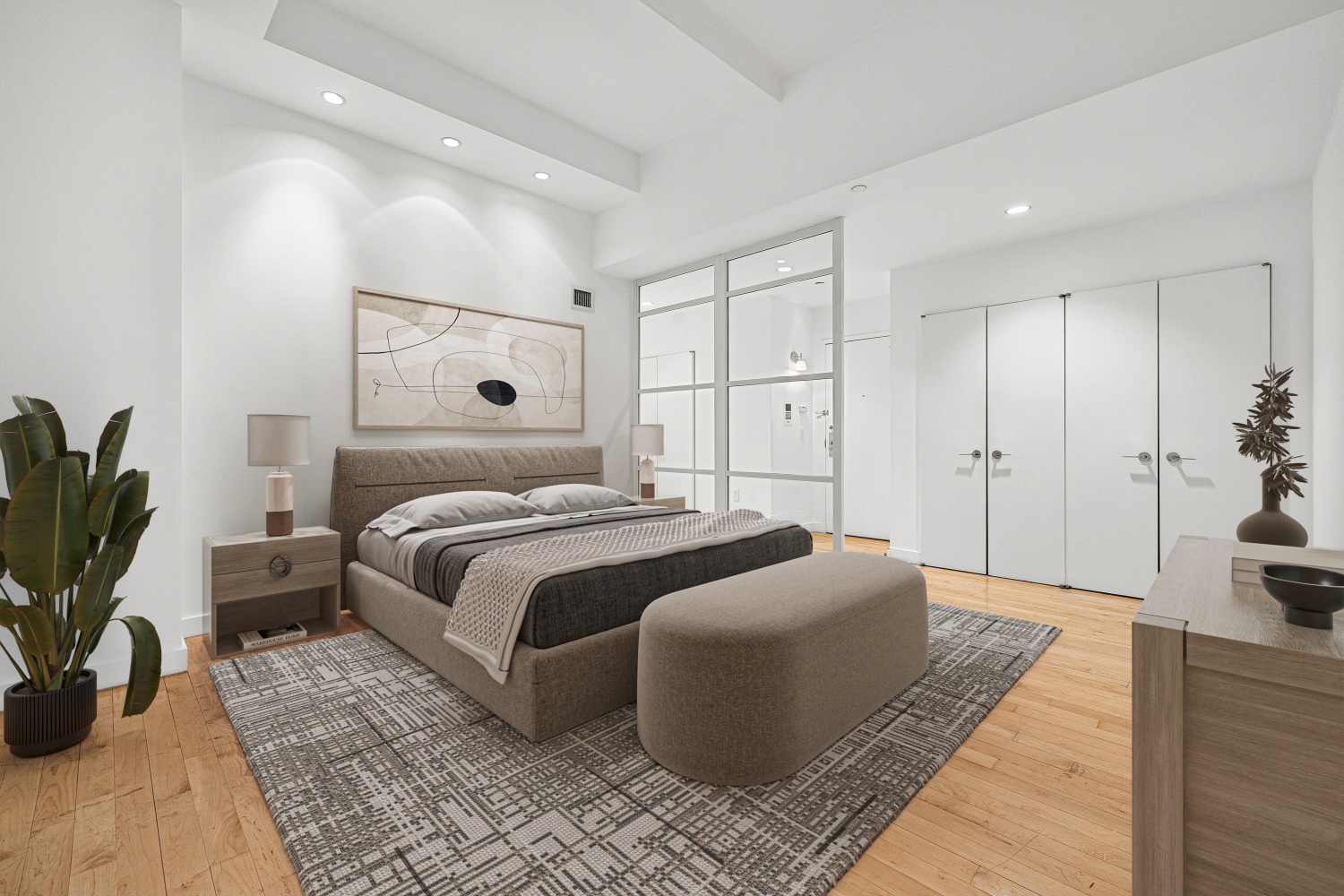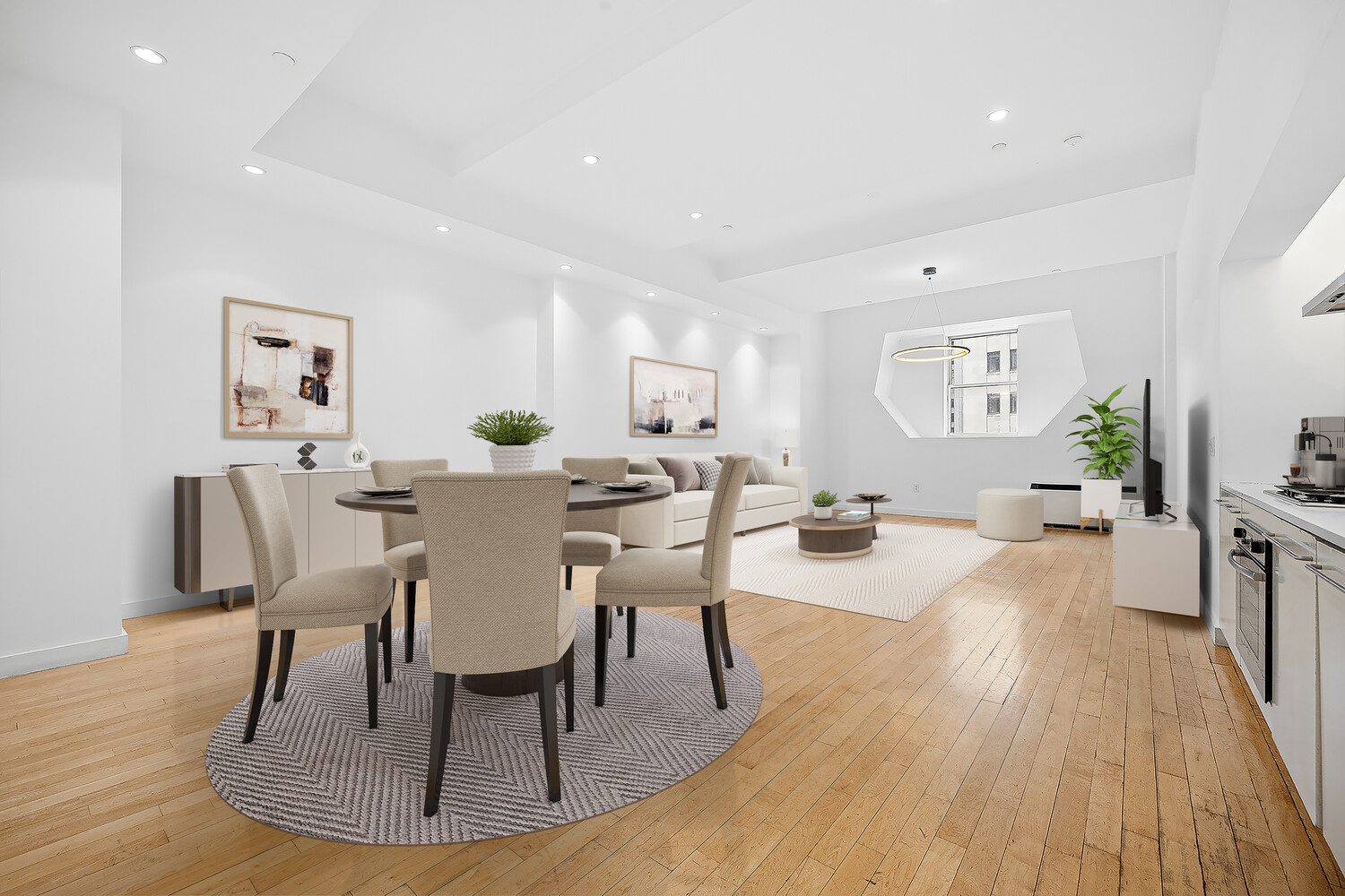 Residence 904 at 15 Broad Street offers approximately 1,200 square feet of thoughtfully designed loft-style living in one of Downtown Manhattan's most iconic luxury buildings, envisioned by Philippe Starck. This expansive one-bedroom home features soaring 13-foot ceilings and a flexible open layout ideal for both relaxing and entertaining.