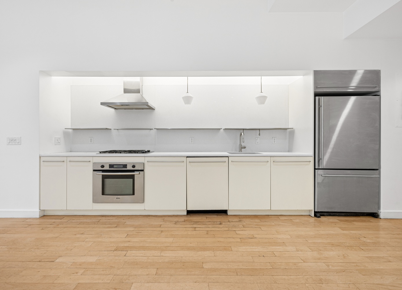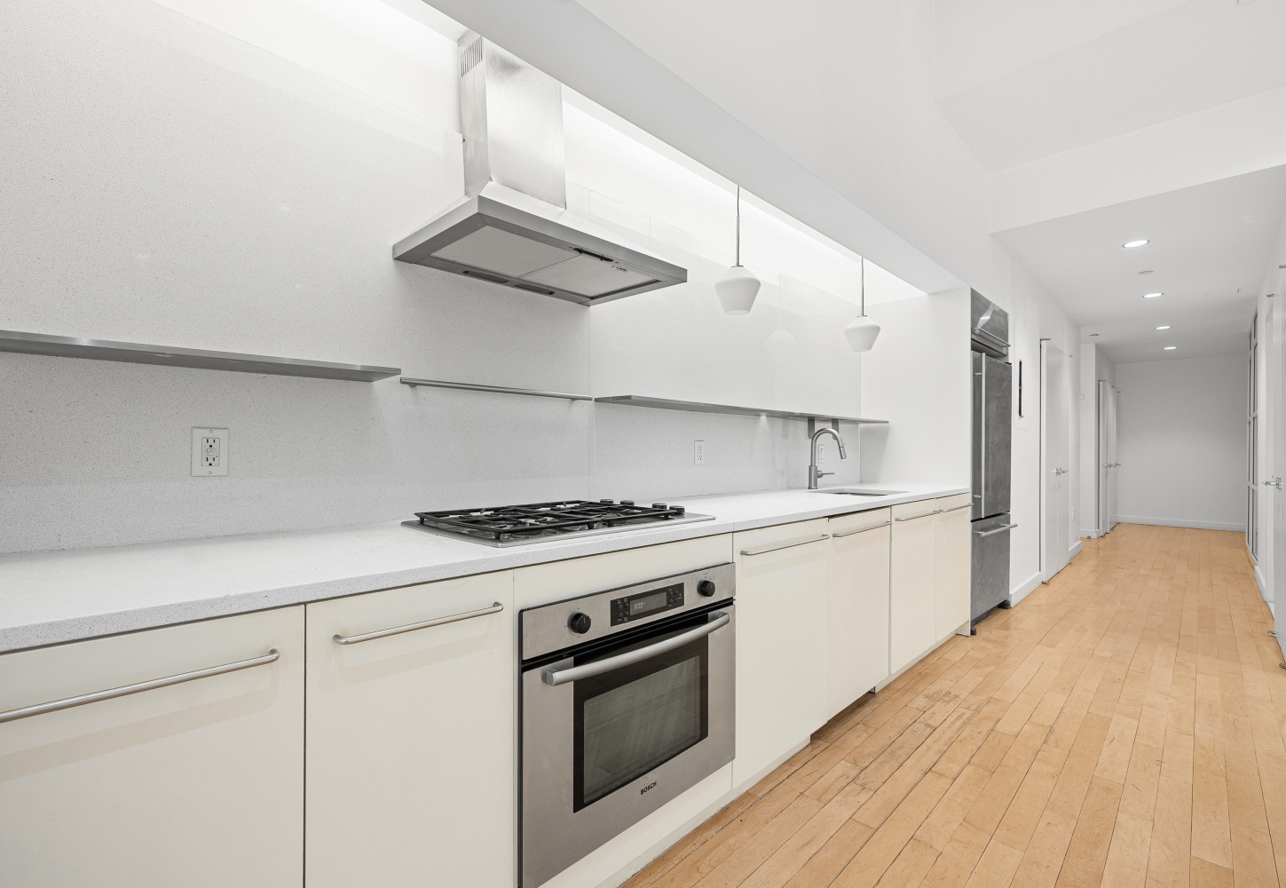 The modern kitchen is equipped with premium stainless steel appliances, including a Bosch gas cooktop, convection oven, dishwasher, and in-unit washer and dryer, along with a JennAir refrigerator and convenient garbage disposal.