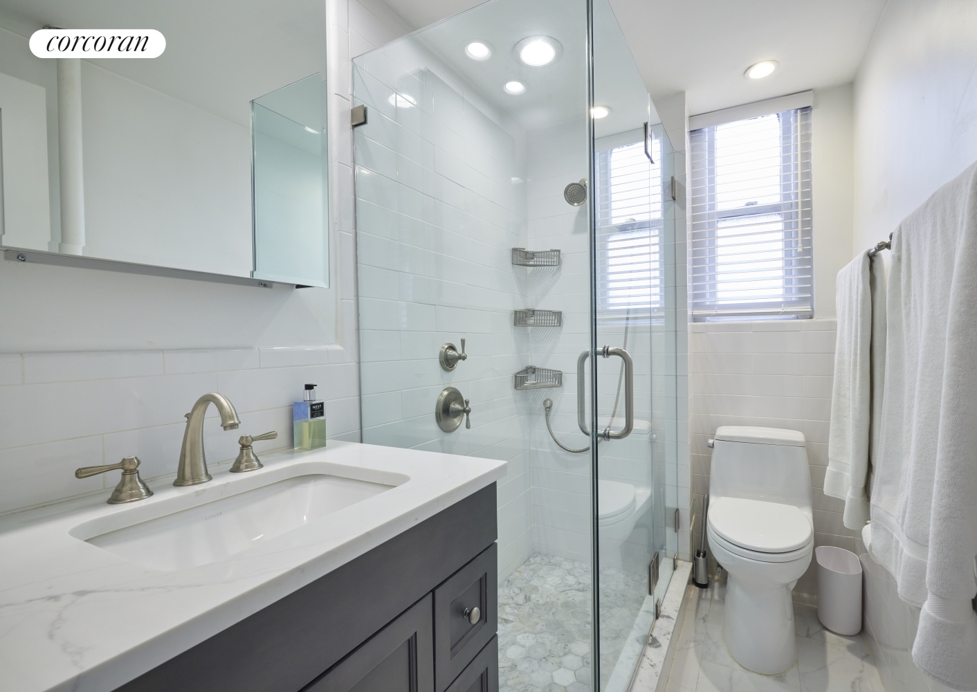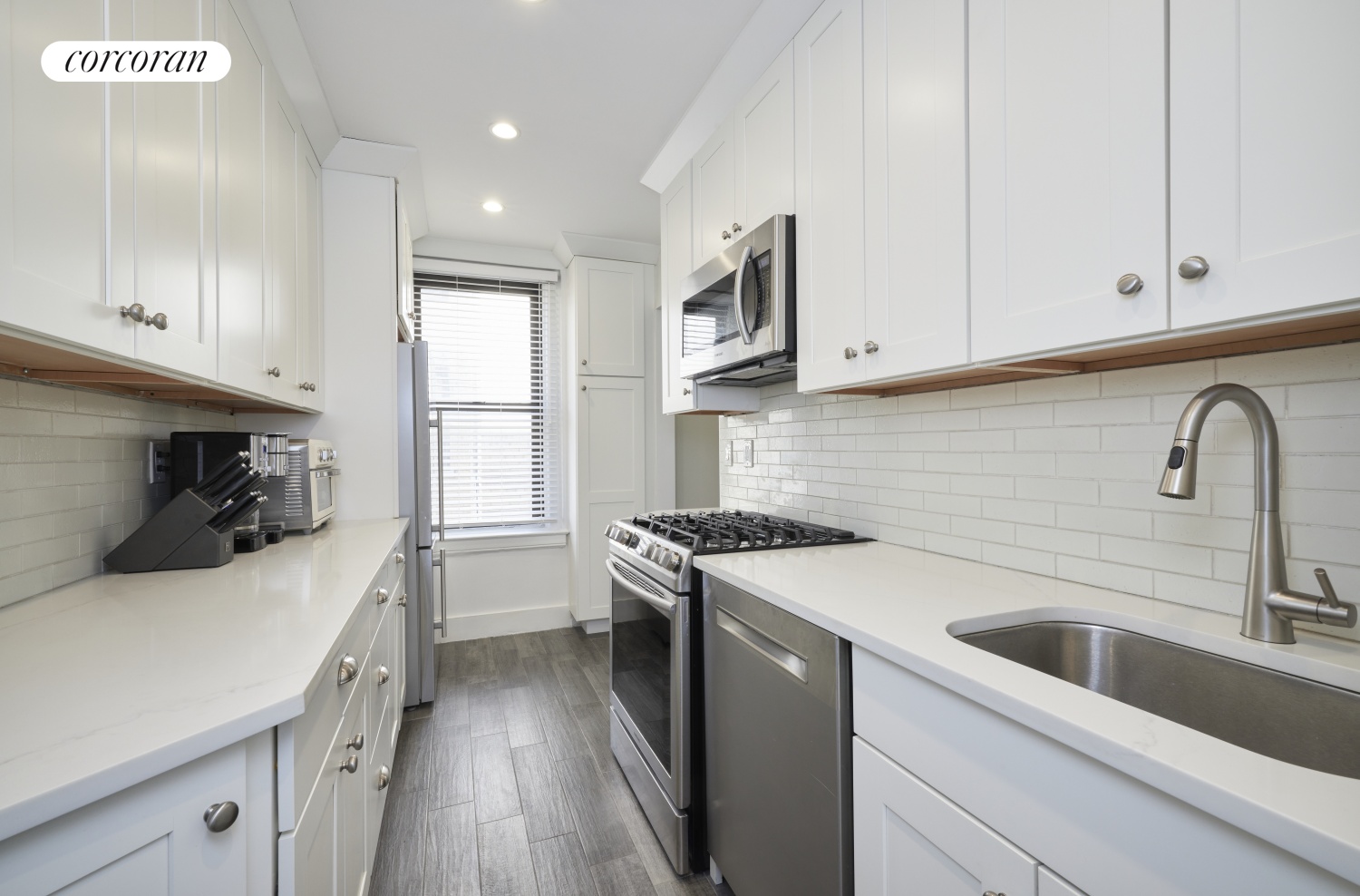 The renovated kitchen features stainless steel appliances, abundant storage and a discreetly tucked away Bosch washer/dryer. The large subway-tiled bathroom, also windowed, has a luxurious walk-in shower and a vanity. The king-sized bedroom is awash in eastern light. Throughout the entire apartment are new wood floors, custom window shutters and new through-wall Friedrich air conditioners.