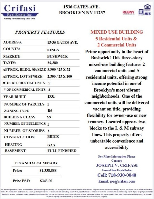 Prime opportunity in the heart of Bushwick! This three-story mixed-use building features 2 commercial units and 5 residential units, offering strong income potential in one of Brooklyns most vibrant neighborhoods. One of the commercial units will be delivered vacant on title, providing flexibility for owner-use or new tenancy. Located approx. two blocks to the L & M subway lines. This property offers unbeatable convenience and accessibility.